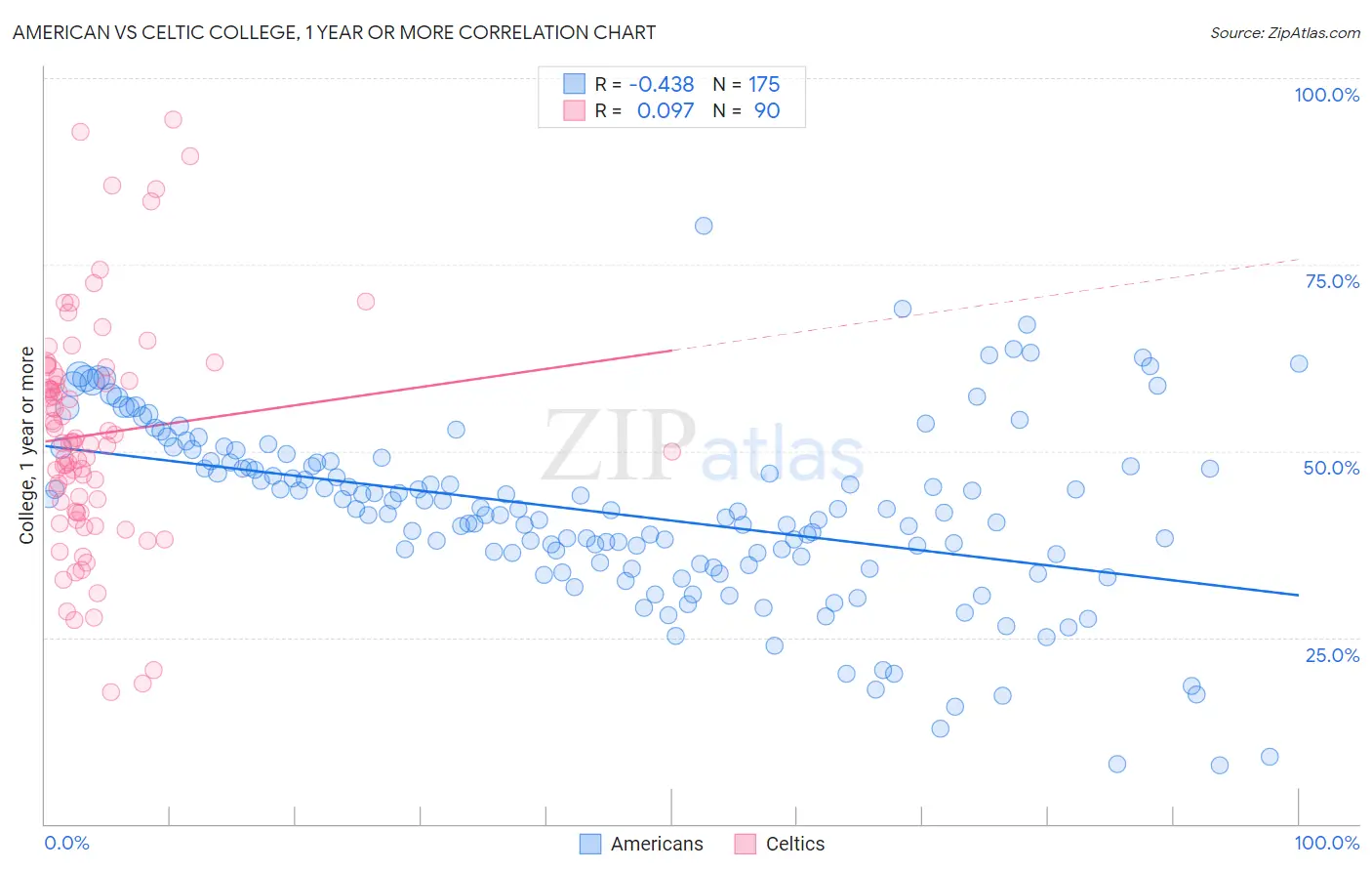 The statistical analysis conducted on geographies consisting of 581,967,268 people shows a moderate negative correlation between the proportion of Americans and percentage of population with at least college, 1 year or more education in the United States with a correlation coefficient (R) of -0.438 and weighted average of 54.4%. Similarly, the statistical analysis conducted on geographies consisting of 168,877,347 people shows a slight positive correlation between the proportion of Celtics and percentage of population with at least college, 1 year or more education in the United States with a correlation coefficient (R) of 0.097 and weighted average of 59.4%, a difference of 9.2%.