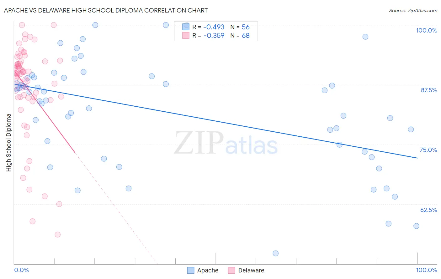 The statistical analysis conducted on geographies consisting of 231,143,094 people shows a moderate negative correlation between the proportion of Apache and percentage of population with at least high school diploma education in the United States with a correlation coefficient (R) of -0.493 and weighted average of 85.1%. Similarly, the statistical analysis conducted on geographies consisting of 96,235,398 people shows a mild negative correlation between the proportion of Delaware and percentage of population with at least high school diploma education in the United States with a correlation coefficient (R) of -0.359 and weighted average of 89.2%, a difference of 4.8%.