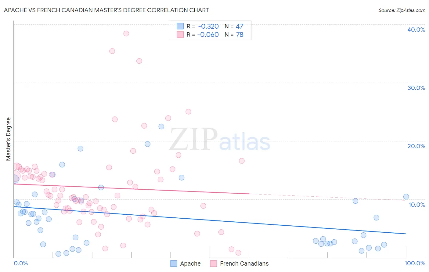 The statistical analysis conducted on geographies consisting of 231,057,413 people shows a mild negative correlation between the proportion of Apache and percentage of population with at least master's degree education in the United States with a correlation coefficient (R) of -0.320 and weighted average of 11.0%. Similarly, the statistical analysis conducted on geographies consisting of 502,359,495 people shows a slight negative correlation between the proportion of French Canadians and percentage of population with at least master's degree education in the United States with a correlation coefficient (R) of -0.060 and weighted average of 14.1%, a difference of 28.5%.