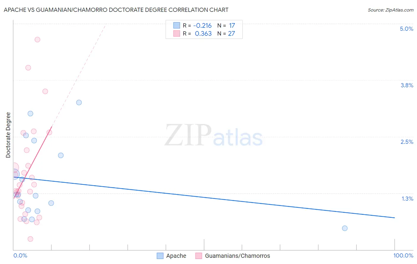The statistical analysis conducted on geographies consisting of 228,067,045 people shows a weak negative correlation between the proportion of Apache and percentage of population with at least doctorate degree education in the United States with a correlation coefficient (R) of -0.216 and weighted average of 1.5%. Similarly, the statistical analysis conducted on geographies consisting of 220,575,272 people shows a mild positive correlation between the proportion of Guamanians/Chamorros and percentage of population with at least doctorate degree education in the United States with a correlation coefficient (R) of 0.363 and weighted average of 1.6%, a difference of 4.2%.