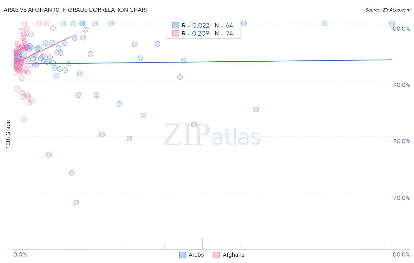 The statistical analysis conducted on geographies consisting of 486,870,847 people shows no correlation between the proportion of Arabs and percentage of population with at least 10th grade education in the United States with a correlation coefficient (R) of 0.022 and weighted average of 94.0%. Similarly, the statistical analysis conducted on geographies consisting of 148,851,685 people shows a weak positive correlation between the proportion of Afghans and percentage of population with at least 10th grade education in the United States with a correlation coefficient (R) of 0.209 and weighted average of 93.1%, a difference of 1.0%.