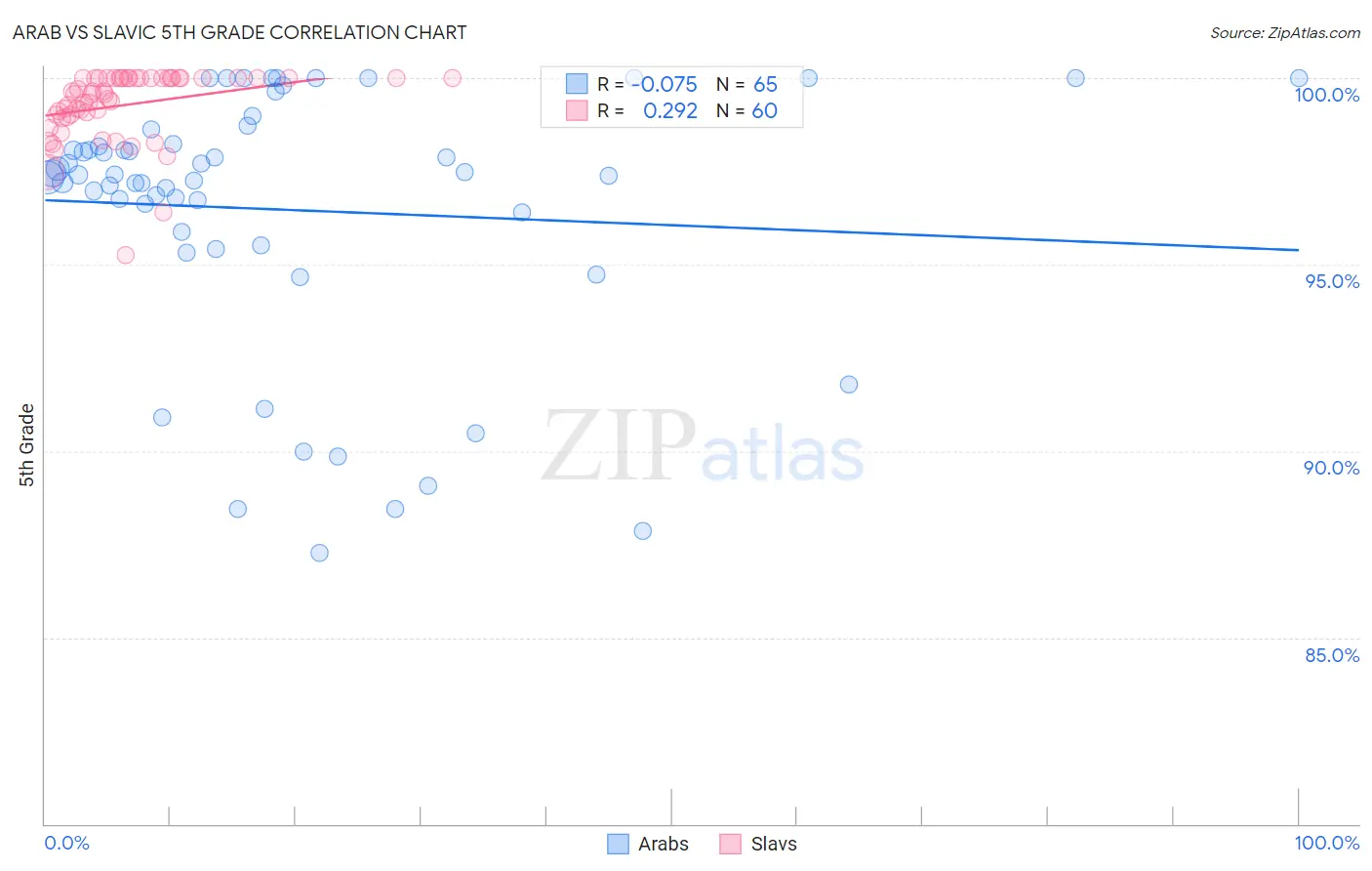 In terms of 5th grade, the demographic groups most similar to Arabs are Immigrants from Belarus (97.3%, a difference of 0.0%), Chilean (97.3%, a difference of 0.0%), Immigrants from Korea (97.3%, a difference of 0.0%), Venezuelan (97.3%, a difference of 0.0%), and Immigrants from Sri Lanka (97.3%, a difference of 0.0%).