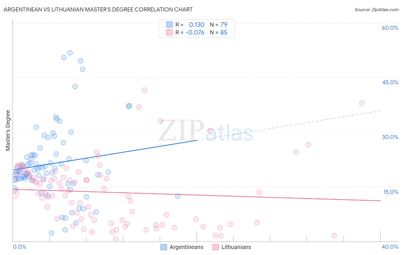 The statistical analysis conducted on geographies consisting of 297,078,027 people shows a poor positive correlation between the proportion of Argentineans and percentage of population with at least master's degree education in the United States with a correlation coefficient (R) of 0.130 and weighted average of 18.2%. Similarly, the statistical analysis conducted on geographies consisting of 421,813,641 people shows a slight negative correlation between the proportion of Lithuanians and percentage of population with at least master's degree education in the United States with a correlation coefficient (R) of -0.076 and weighted average of 17.7%, a difference of 2.5%.