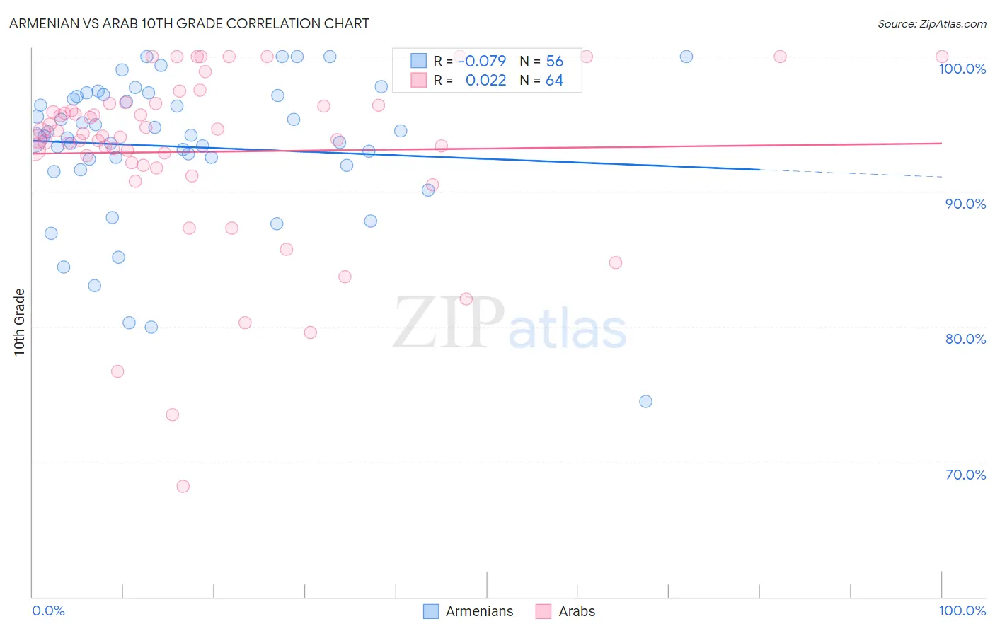 The statistical analysis conducted on geographies consisting of 310,954,685 people shows a slight negative correlation between the proportion of Armenians and percentage of population with at least 10th grade education in the United States with a correlation coefficient (R) of -0.079 and weighted average of 92.7%. Similarly, the statistical analysis conducted on geographies consisting of 486,870,847 people shows no correlation between the proportion of Arabs and percentage of population with at least 10th grade education in the United States with a correlation coefficient (R) of 0.022 and weighted average of 94.0%, a difference of 1.4%.
