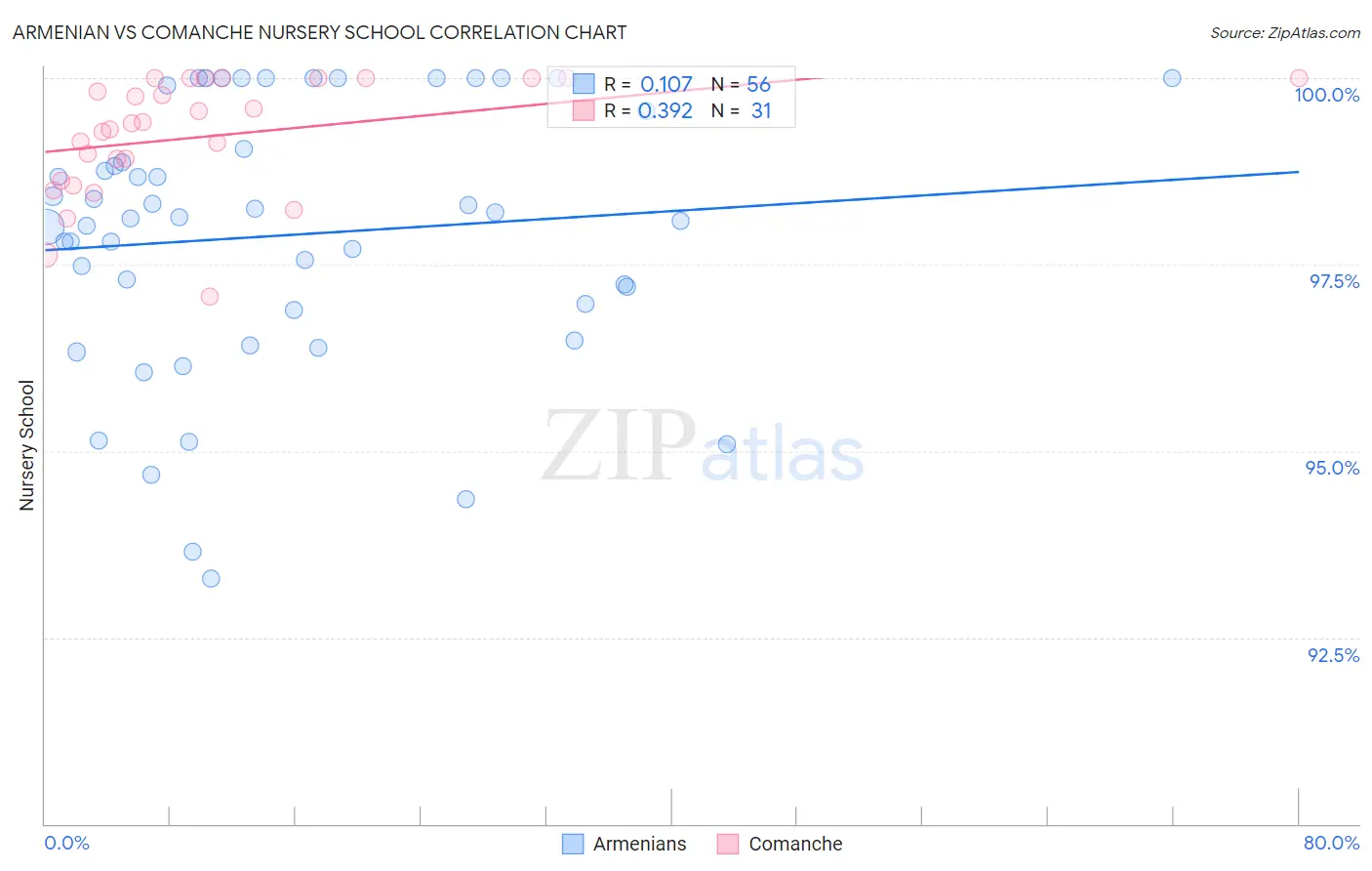 The statistical analysis conducted on geographies consisting of 310,954,660 people shows a poor positive correlation between the proportion of Armenians and percentage of population with at least nursery school education in the United States with a correlation coefficient (R) of 0.107 and weighted average of 97.6%. Similarly, the statistical analysis conducted on geographies consisting of 109,786,530 people shows a mild positive correlation between the proportion of Comanche and percentage of population with at least nursery school education in the United States with a correlation coefficient (R) of 0.392 and weighted average of 98.0%, a difference of 0.46%.