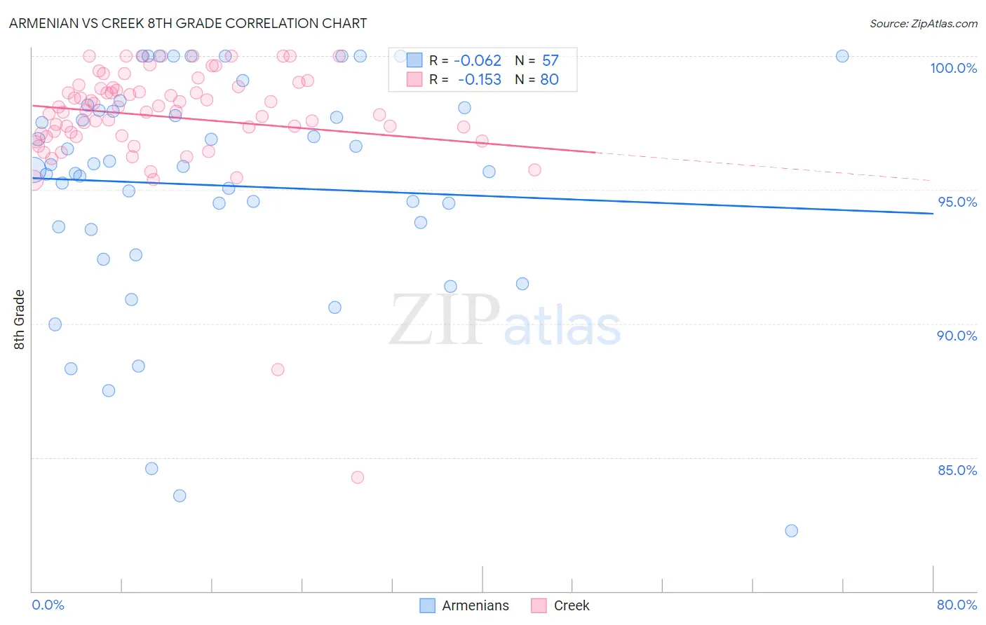 The statistical analysis conducted on geographies consisting of 310,954,801 people shows a slight negative correlation between the proportion of Armenians and percentage of population with at least 8th grade education in the United States with a correlation coefficient (R) of -0.062 and weighted average of 94.7%. Similarly, the statistical analysis conducted on geographies consisting of 178,480,629 people shows a poor negative correlation between the proportion of Creek and percentage of population with at least 8th grade education in the United States with a correlation coefficient (R) of -0.153 and weighted average of 96.6%, a difference of 2.1%.