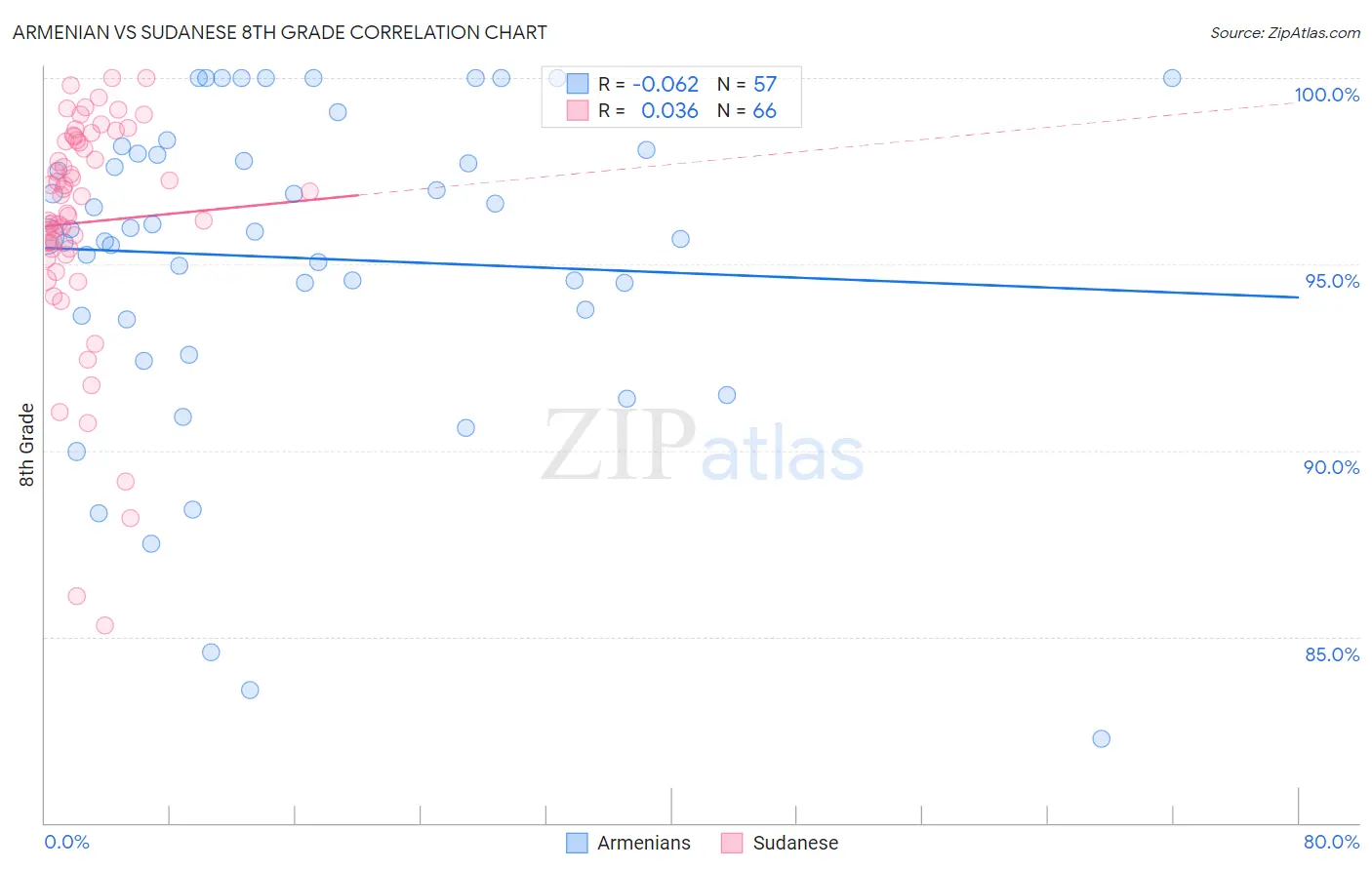 The statistical analysis conducted on geographies consisting of 310,954,801 people shows a slight negative correlation between the proportion of Armenians and percentage of population with at least 8th grade education in the United States with a correlation coefficient (R) of -0.062 and weighted average of 94.7%. Similarly, the statistical analysis conducted on geographies consisting of 110,124,633 people shows no correlation between the proportion of Sudanese and percentage of population with at least 8th grade education in the United States with a correlation coefficient (R) of 0.036 and weighted average of 95.6%, a difference of 1.0%.