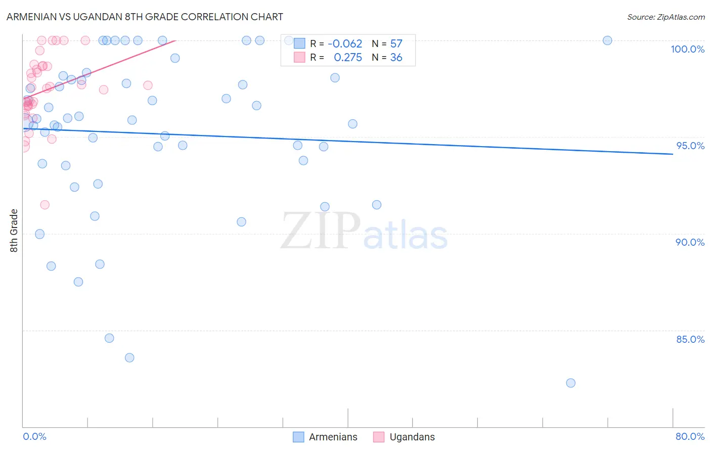 The statistical analysis conducted on geographies consisting of 310,954,801 people shows a slight negative correlation between the proportion of Armenians and percentage of population with at least 8th grade education in the United States with a correlation coefficient (R) of -0.062 and weighted average of 94.7%. Similarly, the statistical analysis conducted on geographies consisting of 93,991,892 people shows a weak positive correlation between the proportion of Ugandans and percentage of population with at least 8th grade education in the United States with a correlation coefficient (R) of 0.275 and weighted average of 95.9%, a difference of 1.3%.