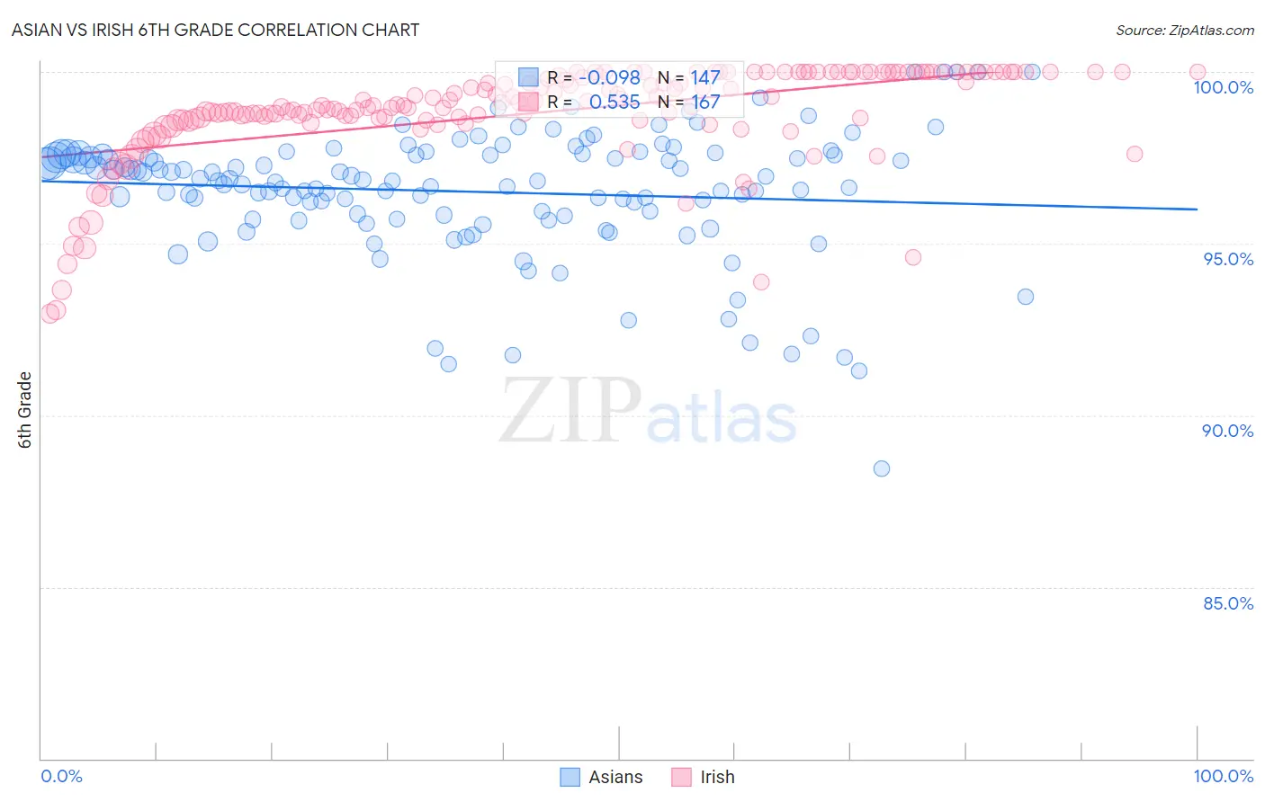 In terms of 6th grade, the demographic groups most similar to Irish are Scottish (98.1%, a difference of 0.010%), Polish (98.1%, a difference of 0.010%), Pennsylvania German (98.1%, a difference of 0.010%), Finnish (98.1%, a difference of 0.010%), and Inupiat (98.1%, a difference of 0.020%).