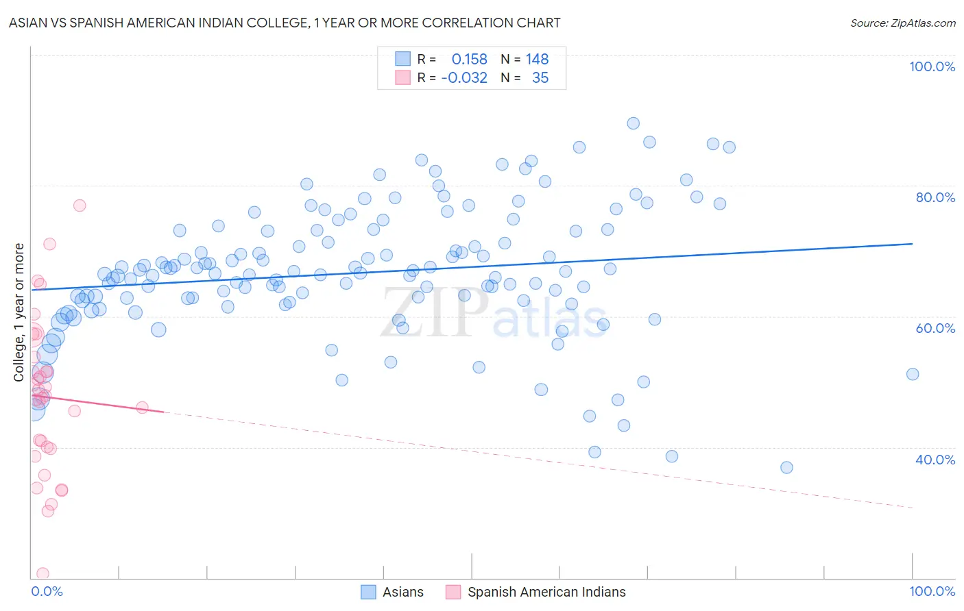Asian vs Spanish American Indian College, 1 year or more Correlation Chart