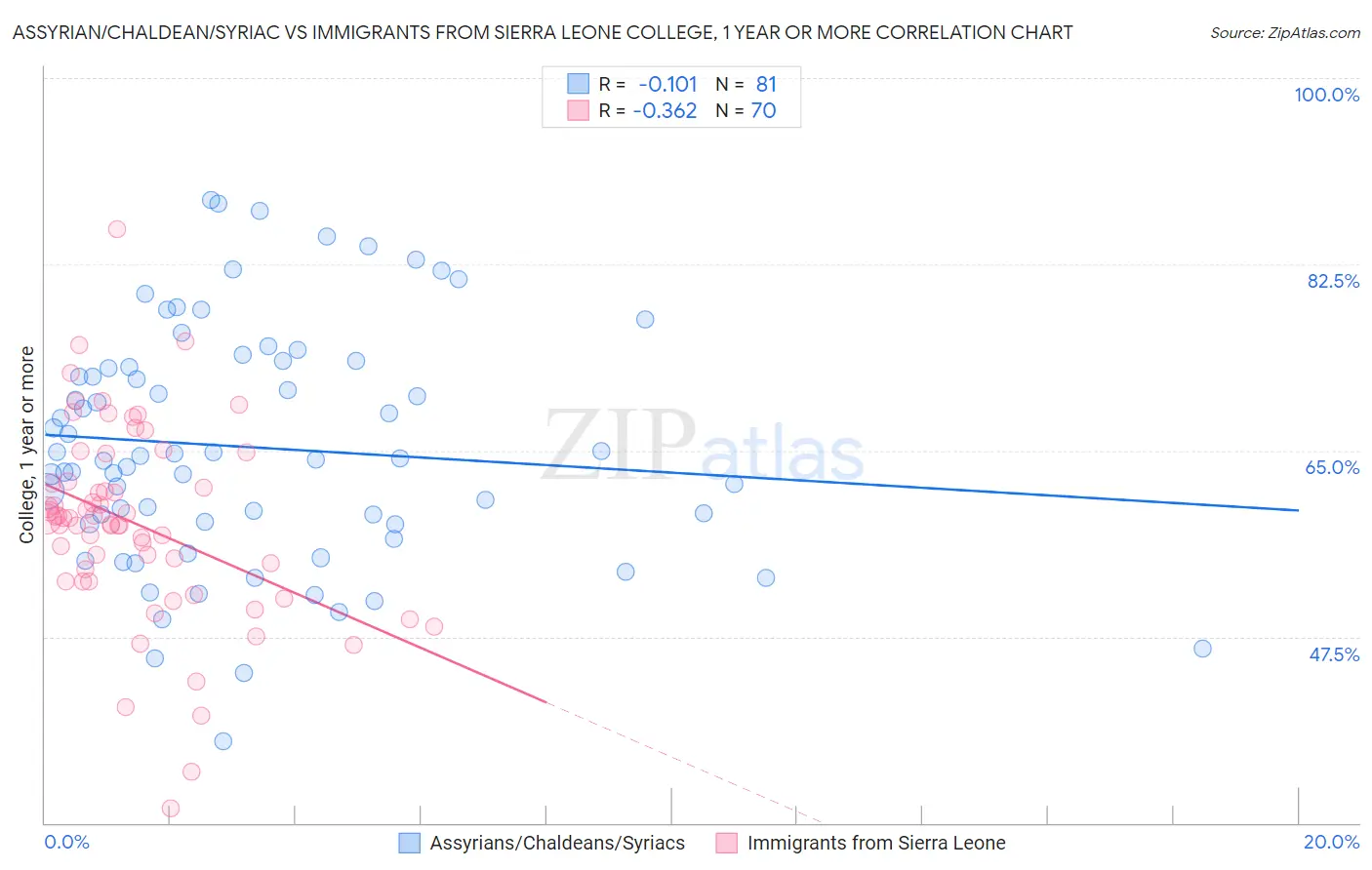 Assyrian/Chaldean/Syriac vs Immigrants from Sierra Leone College, 1 year or more Correlation Chart