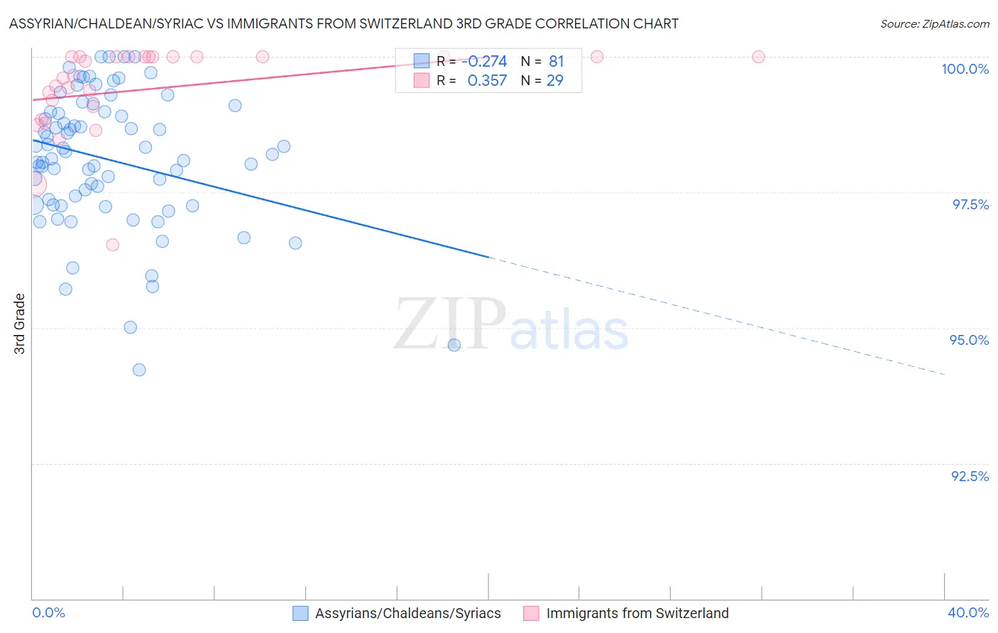 Assyrian/Chaldean/Syriac vs Immigrants from Switzerland 3rd Grade Correlation Chart