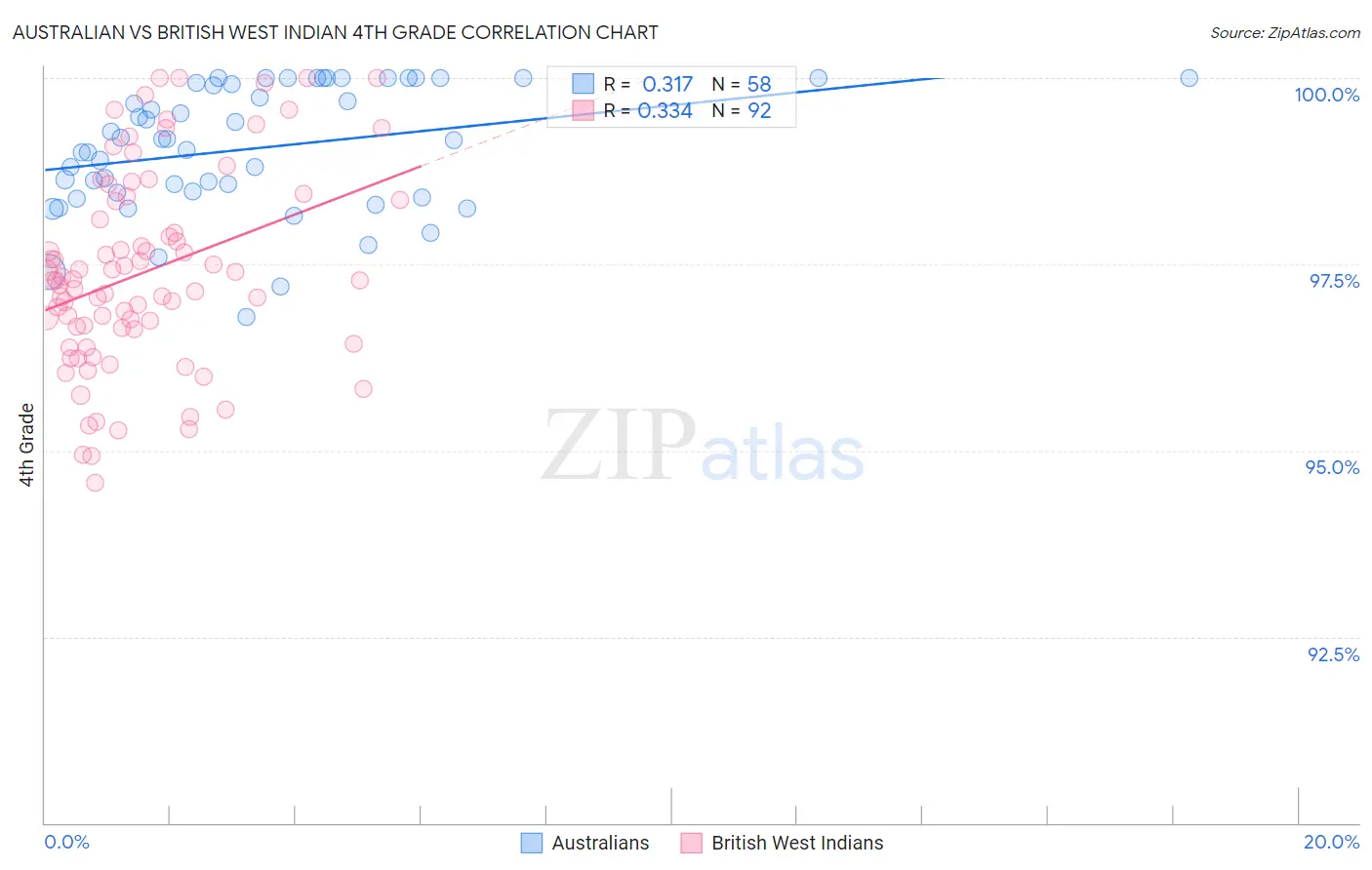 The statistical analysis conducted on geographies consisting of 224,153,392 people shows a mild positive correlation between the proportion of Australians and percentage of population with at least 4th grade education in the United States with a correlation coefficient (R) of 0.317 and weighted average of 98.1%. Similarly, the statistical analysis conducted on geographies consisting of 152,691,173 people shows a mild positive correlation between the proportion of British West Indians and percentage of population with at least 4th grade education in the United States with a correlation coefficient (R) of 0.334 and weighted average of 96.7%, a difference of 1.4%.