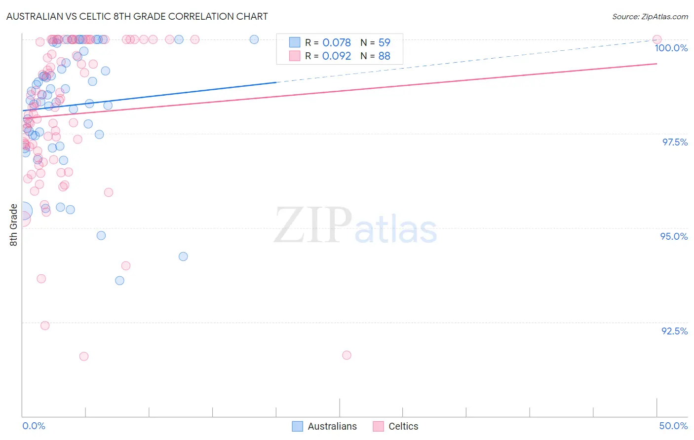 In terms of 8th grade, the demographic groups most similar to Australians are Serbian (96.7%, a difference of 0.0%), Russian (96.7%, a difference of 0.0%), Macedonian (96.7%, a difference of 0.0%), Austrian (96.7%, a difference of 0.010%), and Greek (96.8%, a difference of 0.030%). Similarly, the demographic groups most similar to Celtics are Immigrants from Scotland (96.8%, a difference of 0.010%), Estonian (96.8%, a difference of 0.020%), Slavic (96.8%, a difference of 0.030%), Greek (96.8%, a difference of 0.030%), and Austrian (96.7%, a difference of 0.050%).