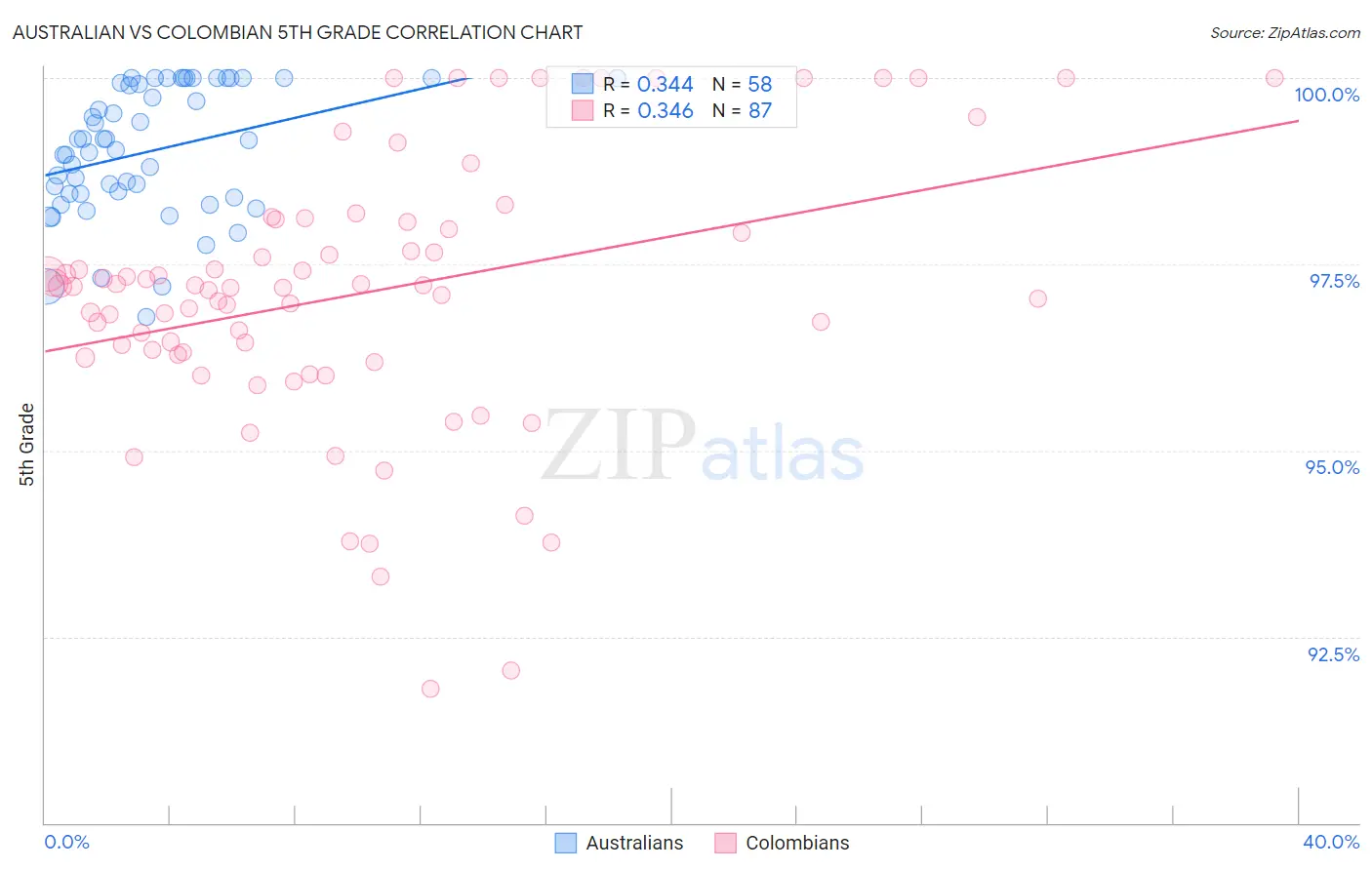 The statistical analysis conducted on geographies consisting of 224,153,392 people shows a mild positive correlation between the proportion of Australians and percentage of population with at least 5th grade education in the United States with a correlation coefficient (R) of 0.344 and weighted average of 98.0%. Similarly, the statistical analysis conducted on geographies consisting of 419,701,178 people shows a mild positive correlation between the proportion of Colombians and percentage of population with at least 5th grade education in the United States with a correlation coefficient (R) of 0.346 and weighted average of 96.9%, a difference of 1.1%.