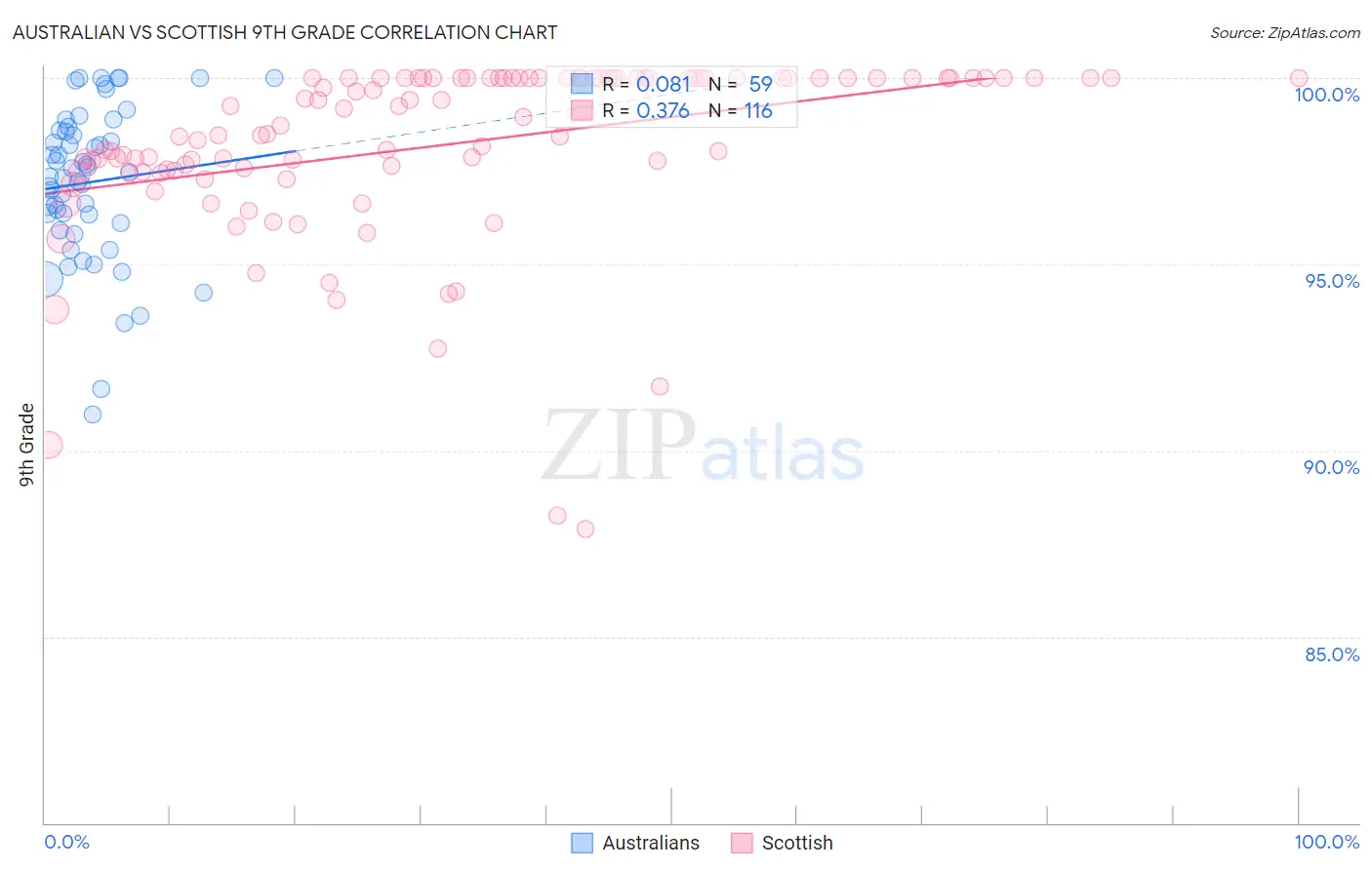 The statistical analysis conducted on geographies consisting of 224,153,693 people shows a slight positive correlation between the proportion of Australians and percentage of population with at least 9th grade education in the United States with a correlation coefficient (R) of 0.081 and weighted average of 96.0%. Similarly, the statistical analysis conducted on geographies consisting of 567,141,209 people shows a mild positive correlation between the proportion of Scottish and percentage of population with at least 9th grade education in the United States with a correlation coefficient (R) of 0.376 and weighted average of 96.5%, a difference of 0.50%.