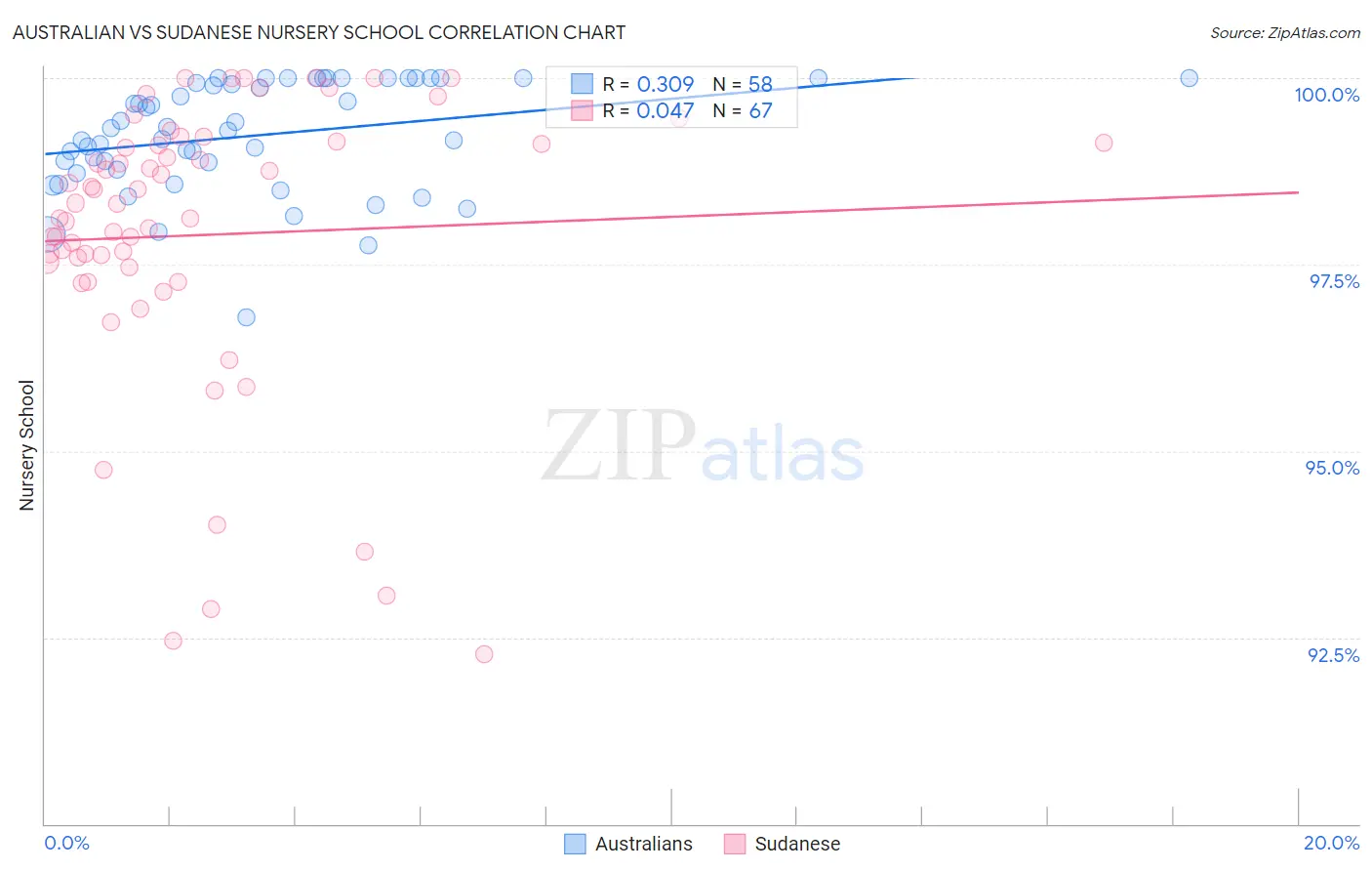The statistical analysis conducted on geographies consisting of 224,153,392 people shows a mild positive correlation between the proportion of Australians and percentage of population with at least nursery school education in the United States with a correlation coefficient (R) of 0.309 and weighted average of 98.5%. Similarly, the statistical analysis conducted on geographies consisting of 110,145,984 people shows no correlation between the proportion of Sudanese and percentage of population with at least nursery school education in the United States with a correlation coefficient (R) of 0.047 and weighted average of 97.7%, a difference of 0.74%.