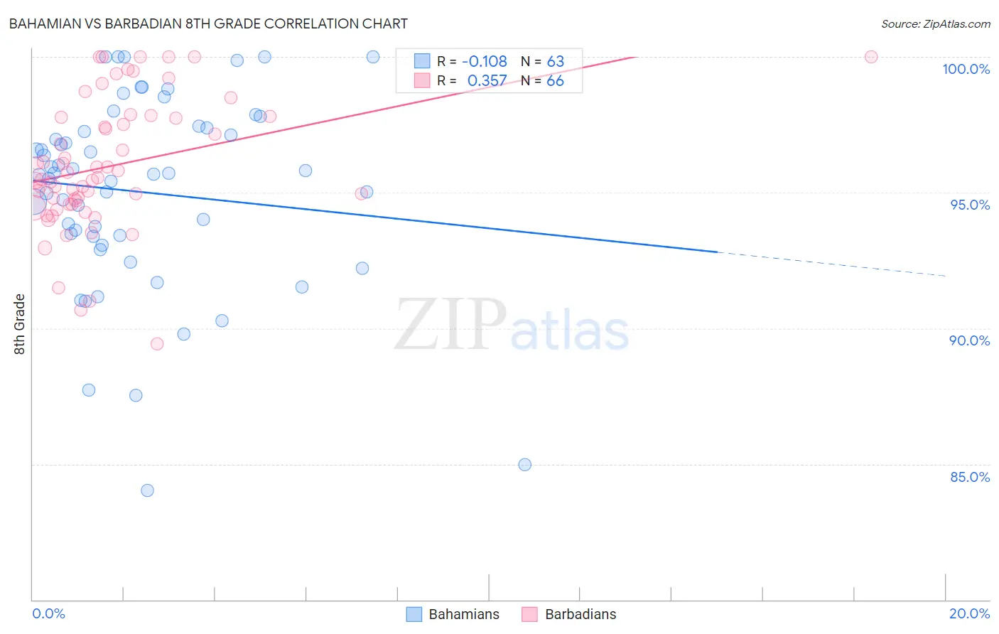 The statistical analysis conducted on geographies consisting of 112,698,819 people shows a poor negative correlation between the proportion of Bahamians and percentage of population with at least 8th grade education in the United States with a correlation coefficient (R) of -0.108 and weighted average of 95.3%. Similarly, the statistical analysis conducted on geographies consisting of 141,299,217 people shows a mild positive correlation between the proportion of Barbadians and percentage of population with at least 8th grade education in the United States with a correlation coefficient (R) of 0.357 and weighted average of 94.6%, a difference of 0.69%.