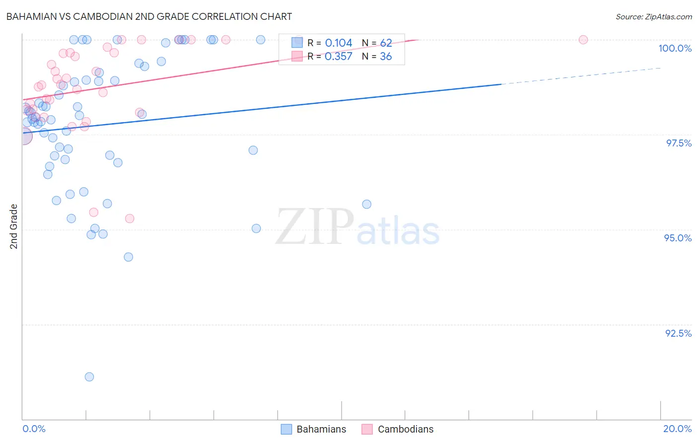The statistical analysis conducted on geographies consisting of 112,673,855 people shows a poor positive correlation between the proportion of Bahamians and percentage of population with at least 2nd grade education in the United States with a correlation coefficient (R) of 0.104 and weighted average of 97.7%. Similarly, the statistical analysis conducted on geographies consisting of 102,511,743 people shows a mild positive correlation between the proportion of Cambodians and percentage of population with at least 2nd grade education in the United States with a correlation coefficient (R) of 0.357 and weighted average of 98.0%, a difference of 0.39%.