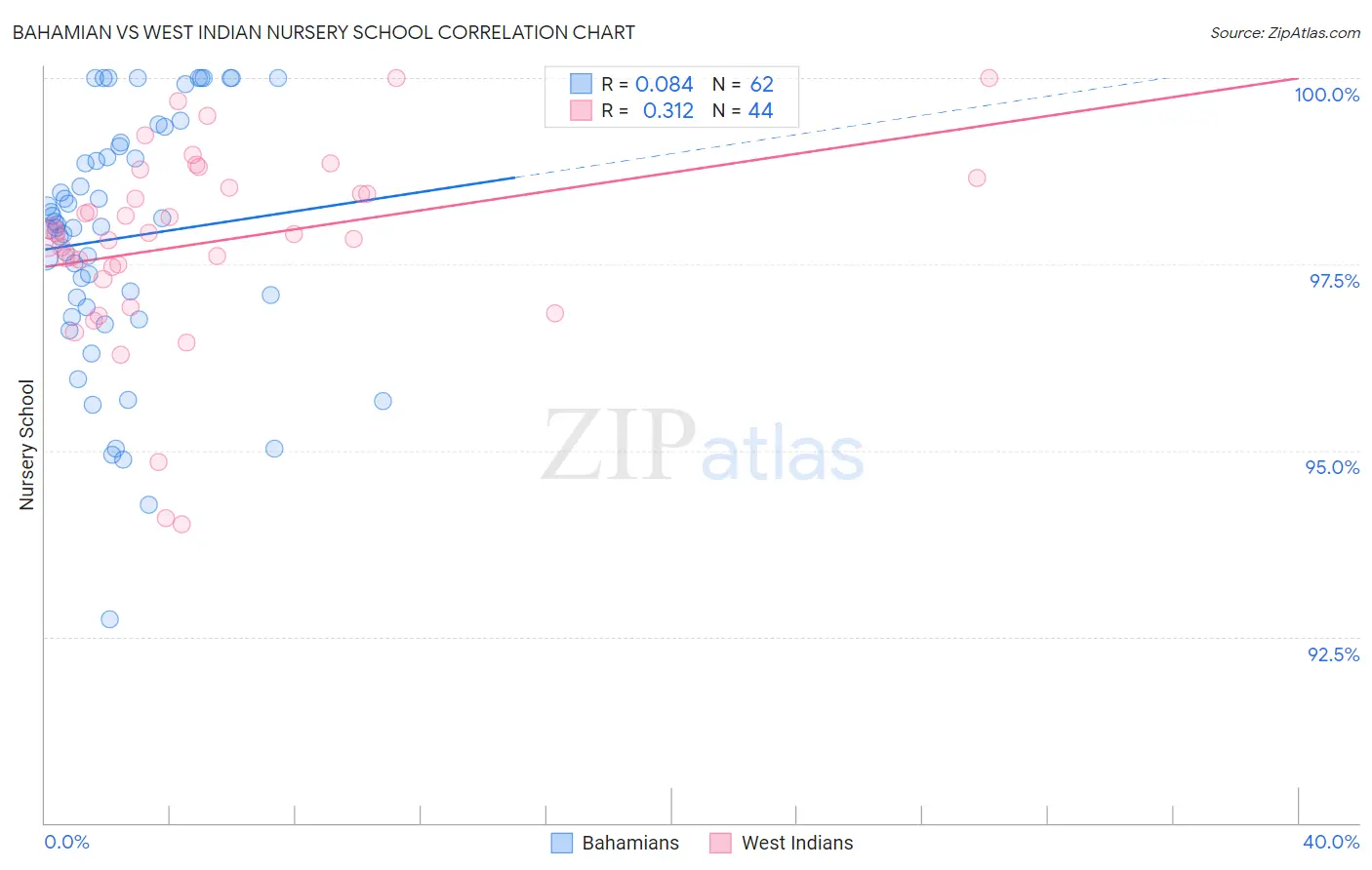 In terms of nursery school, the demographic groups most similar to West Indians are Immigrants from Nigeria (97.5%, a difference of 0.0%), Immigrants from Liberia (97.5%, a difference of 0.0%), Immigrants from Sierra Leone (97.6%, a difference of 0.010%), Immigrants from Jamaica (97.5%, a difference of 0.010%), and Fijian (97.6%, a difference of 0.020%).