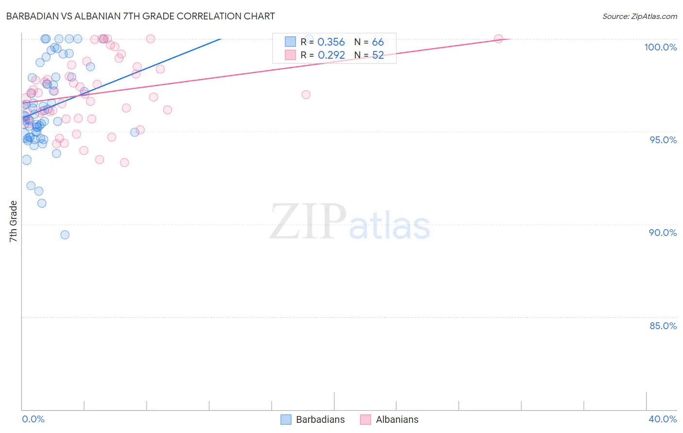 The statistical analysis conducted on geographies consisting of 141,299,217 people shows a mild positive correlation between the proportion of Barbadians and percentage of population with at least 7th grade education in the United States with a correlation coefficient (R) of 0.356 and weighted average of 95.1%. Similarly, the statistical analysis conducted on geographies consisting of 193,265,850 people shows a weak positive correlation between the proportion of Albanians and percentage of population with at least 7th grade education in the United States with a correlation coefficient (R) of 0.292 and weighted average of 96.3%, a difference of 1.3%.