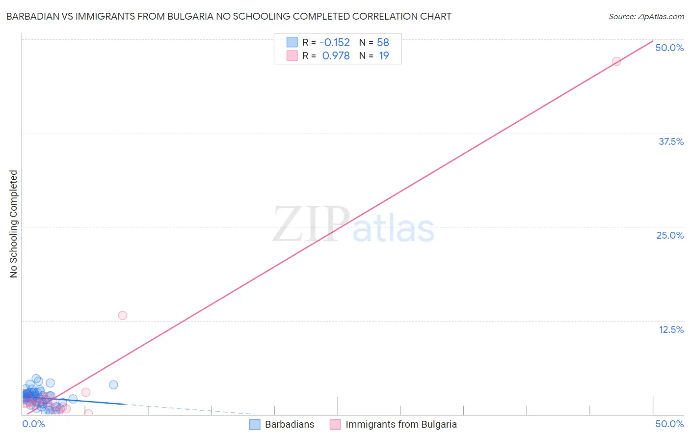 Barbadian vs Immigrants from Bulgaria No Schooling Completed Correlation Chart