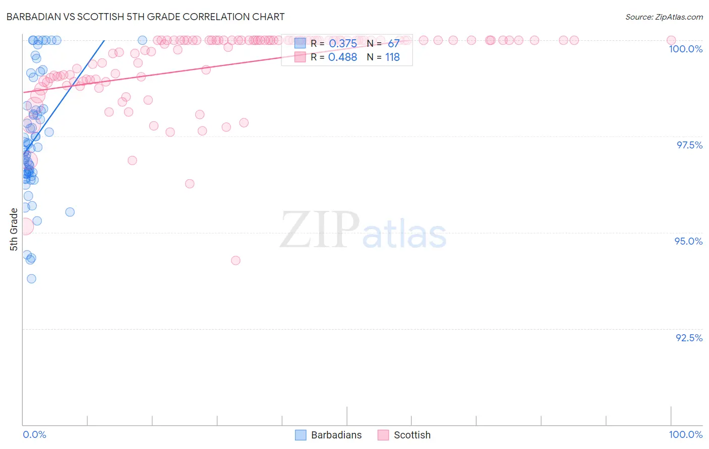 The statistical analysis conducted on geographies consisting of 141,304,590 people shows a mild positive correlation between the proportion of Barbadians and percentage of population with at least 5th grade education in the United States with a correlation coefficient (R) of 0.375 and weighted average of 96.6%. Similarly, the statistical analysis conducted on geographies consisting of 567,141,733 people shows a moderate positive correlation between the proportion of Scottish and percentage of population with at least 5th grade education in the United States with a correlation coefficient (R) of 0.488 and weighted average of 98.3%, a difference of 1.7%.