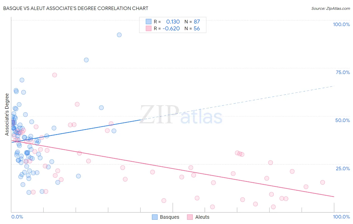 The statistical analysis conducted on geographies consisting of 165,778,580 people shows a poor positive correlation between the proportion of Basques and percentage of population with at least associate's degree education in the United States with a correlation coefficient (R) of 0.130 and weighted average of 46.5%. Similarly, the statistical analysis conducted on geographies consisting of 61,782,803 people shows a significant negative correlation between the proportion of Aleuts and percentage of population with at least associate's degree education in the United States with a correlation coefficient (R) of -0.620 and weighted average of 39.6%, a difference of 17.2%.