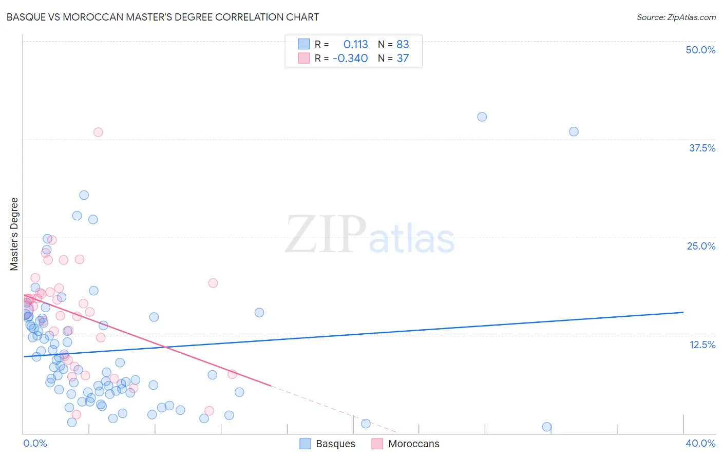 The statistical analysis conducted on geographies consisting of 165,765,652 people shows a poor positive correlation between the proportion of Basques and percentage of population with at least master's degree education in the United States with a correlation coefficient (R) of 0.113 and weighted average of 14.7%. Similarly, the statistical analysis conducted on geographies consisting of 201,797,858 people shows a mild negative correlation between the proportion of Moroccans and percentage of population with at least master's degree education in the United States with a correlation coefficient (R) of -0.340 and weighted average of 16.8%, a difference of 14.5%.