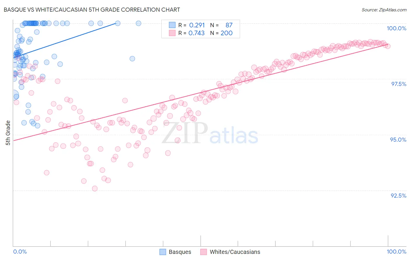 In terms of 5th grade, the demographic groups most similar to Basques are Immigrants from Saudi Arabia (97.6%, a difference of 0.0%), Syrian (97.6%, a difference of 0.0%), Lebanese (97.6%, a difference of 0.010%), Okinawan (97.6%, a difference of 0.010%), and Immigrants from Croatia (97.6%, a difference of 0.010%).