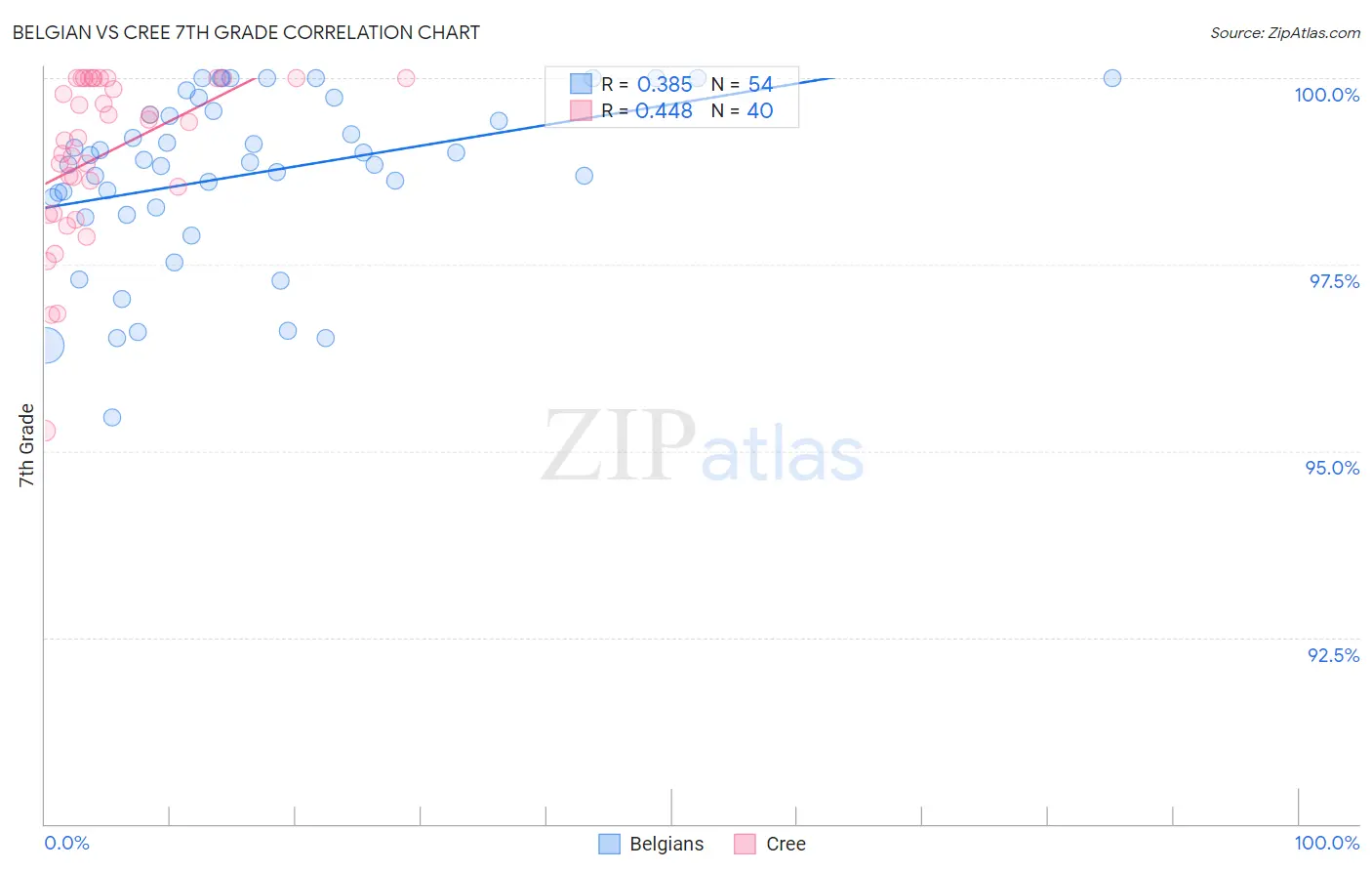 In terms of 7th grade, the demographic groups most similar to Cree are Immigrants from Belgium (96.7%, a difference of 0.0%), Puget Sound Salish (96.7%, a difference of 0.0%), Turkish (96.7%, a difference of 0.010%), Immigrants from South Africa (96.7%, a difference of 0.010%), and Osage (96.7%, a difference of 0.010%).