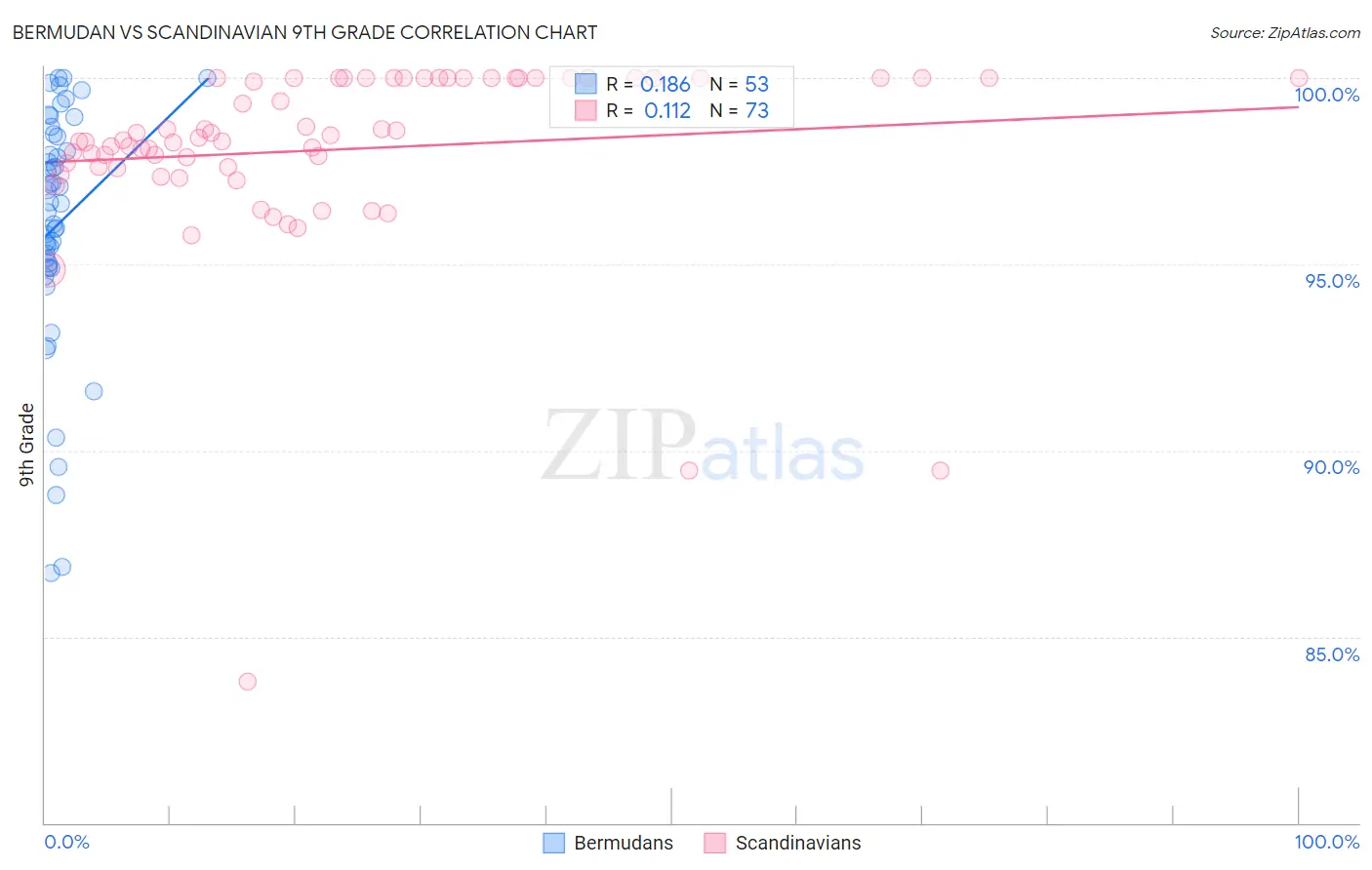 In terms of 9th grade, the demographic groups most similar to Bermudans are Immigrants from Ukraine (95.0%, a difference of 0.010%), Immigrants from Italy (95.0%, a difference of 0.010%), French American Indian (95.0%, a difference of 0.010%), Pakistani (95.0%, a difference of 0.010%), and Venezuelan (95.0%, a difference of 0.020%).