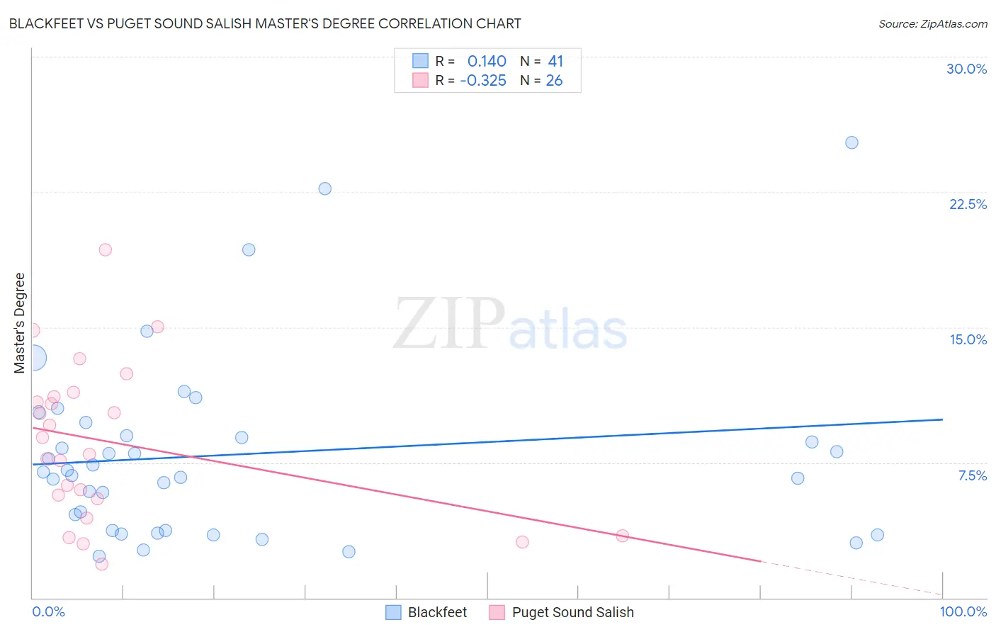 The statistical analysis conducted on geographies consisting of 309,479,249 people shows a poor positive correlation between the proportion of Blackfeet and percentage of population with at least master's degree education in the United States with a correlation coefficient (R) of 0.140 and weighted average of 12.1%. Similarly, the statistical analysis conducted on geographies consisting of 46,155,292 people shows a mild negative correlation between the proportion of Puget Sound Salish and percentage of population with at least master's degree education in the United States with a correlation coefficient (R) of -0.325 and weighted average of 11.1%, a difference of 8.5%.