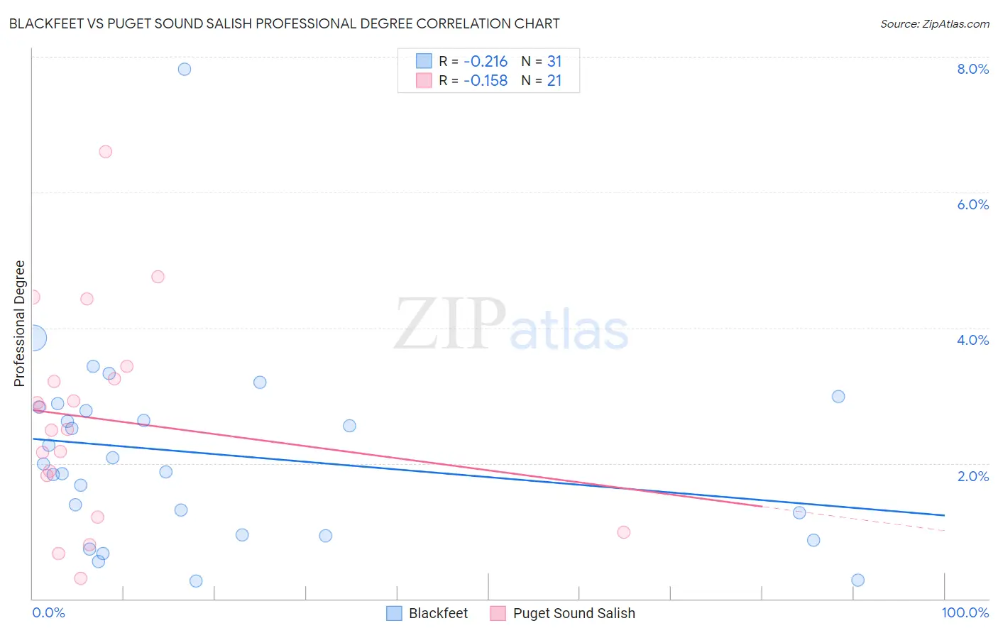 The statistical analysis conducted on geographies consisting of 308,370,699 people shows a weak negative correlation between the proportion of Blackfeet and percentage of population with at least professional degree education in the United States with a correlation coefficient (R) of -0.216 and weighted average of 3.5%. Similarly, the statistical analysis conducted on geographies consisting of 46,093,850 people shows a poor negative correlation between the proportion of Puget Sound Salish and percentage of population with at least professional degree education in the United States with a correlation coefficient (R) of -0.158 and weighted average of 3.1%, a difference of 12.9%.