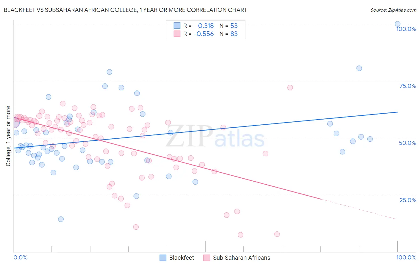 Blackfeet vs Subsaharan African College, 1 year or more Correlation Chart