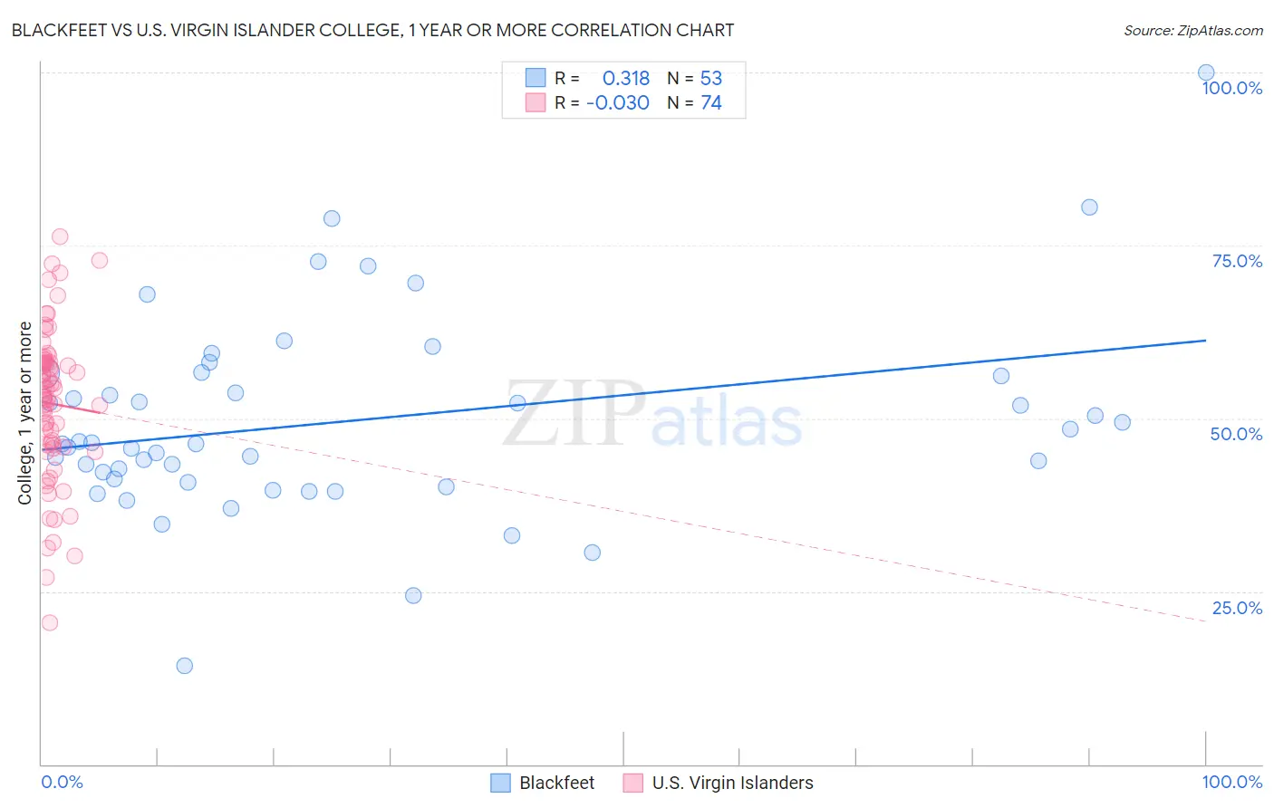 Blackfeet vs U.S. Virgin Islander College, 1 year or more Correlation Chart