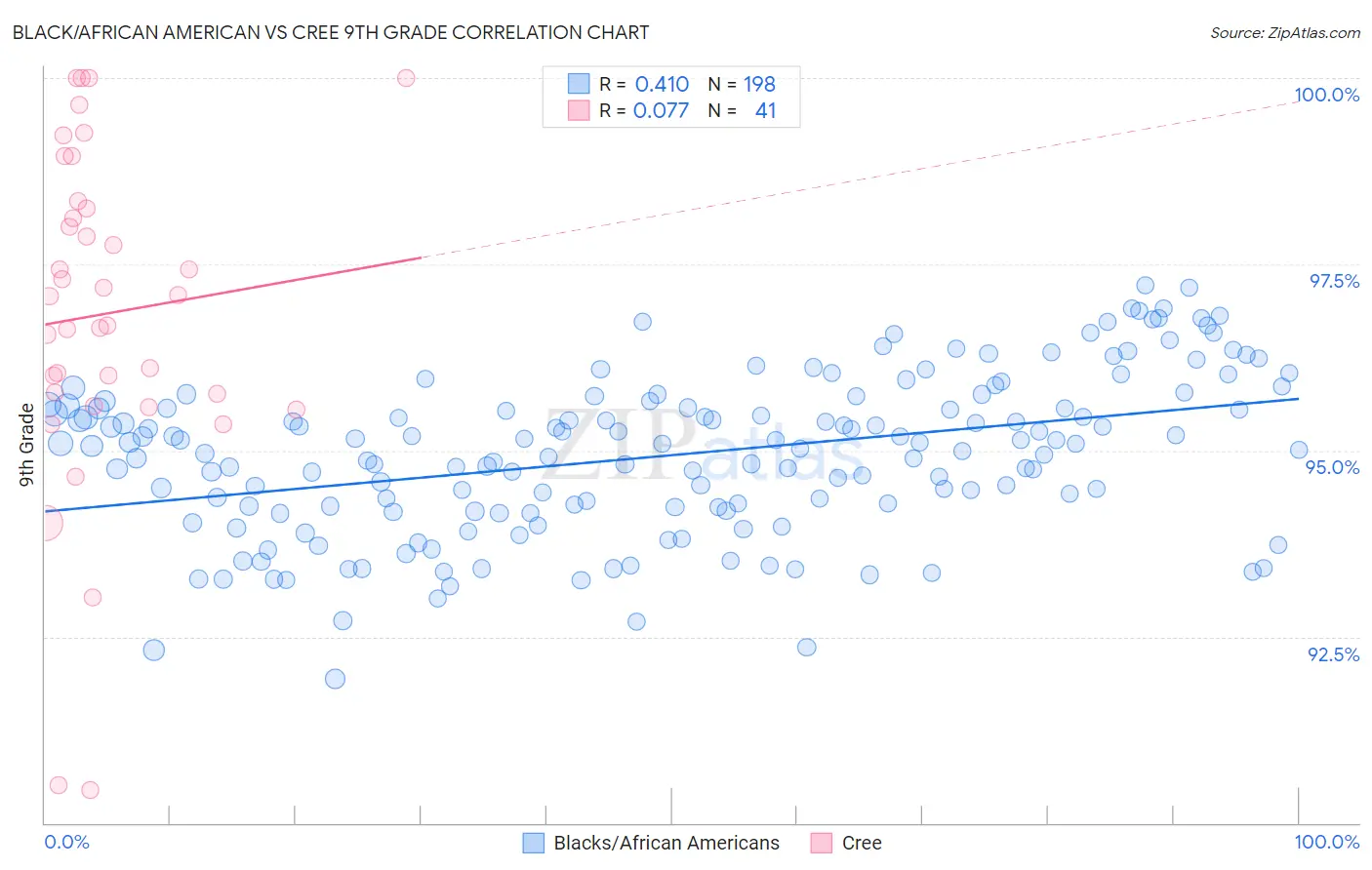 The statistical analysis conducted on geographies consisting of 561,177,282 people shows a moderate positive correlation between the proportion of Blacks/African Americans and percentage of population with at least 9th grade education in the United States with a correlation coefficient (R) of 0.410 and weighted average of 94.6%. Similarly, the statistical analysis conducted on geographies consisting of 76,211,744 people shows a slight positive correlation between the proportion of Cree and percentage of population with at least 9th grade education in the United States with a correlation coefficient (R) of 0.077 and weighted average of 95.4%, a difference of 0.81%.