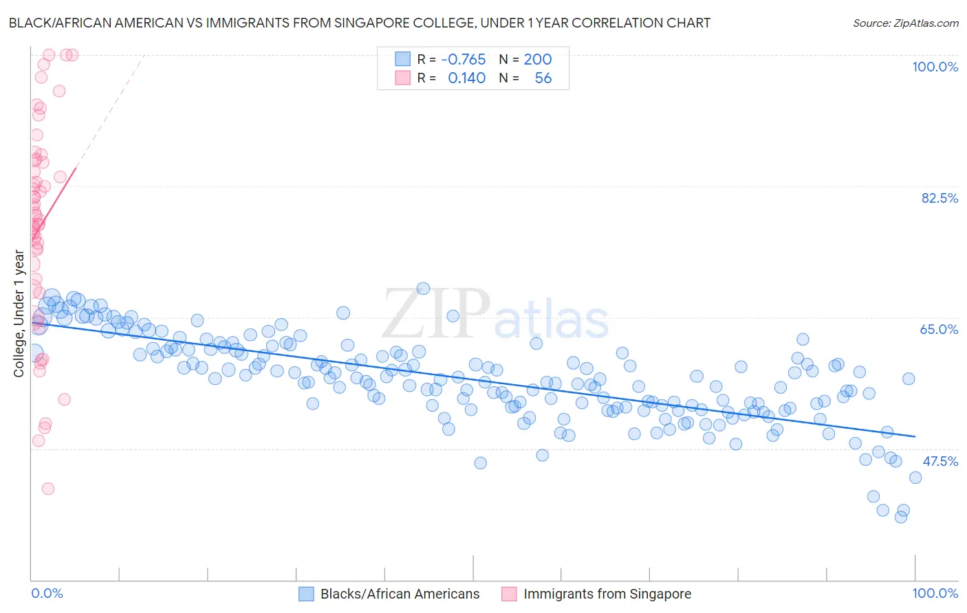 Black/African American vs Immigrants from Singapore College, Under 1 year Correlation Chart