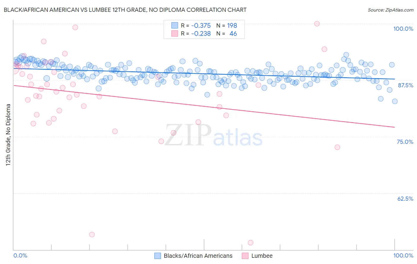 Black/African American vs Lumbee 12th Grade, No Diploma Correlation Chart