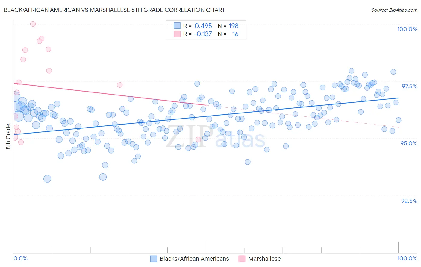 In terms of 8th grade, the demographic groups most similar to Blacks/African Americans are Brazilian (95.6%, a difference of 0.0%), Immigrants from Iraq (95.6%, a difference of 0.010%), Immigrants from Uganda (95.6%, a difference of 0.010%), Sudanese (95.6%, a difference of 0.010%), and Immigrants from Egypt (95.7%, a difference of 0.020%). Similarly, the demographic groups most similar to Marshallese are Venezuelan (95.7%, a difference of 0.0%), Immigrants from Albania (95.7%, a difference of 0.010%), Pakistani (95.7%, a difference of 0.010%), Immigrants from Brazil (95.7%, a difference of 0.010%), and Chilean (95.7%, a difference of 0.020%).