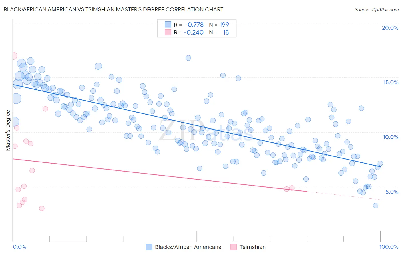 The statistical analysis conducted on geographies consisting of 563,961,779 people shows a strong negative correlation between the proportion of Blacks/African Americans and percentage of population with at least master's degree education in the United States with a correlation coefficient (R) of -0.778 and weighted average of 12.1%. Similarly, the statistical analysis conducted on geographies consisting of 15,626,544 people shows a weak negative correlation between the proportion of Tsimshian and percentage of population with at least master's degree education in the United States with a correlation coefficient (R) of -0.240 and weighted average of 11.4%, a difference of 5.9%.