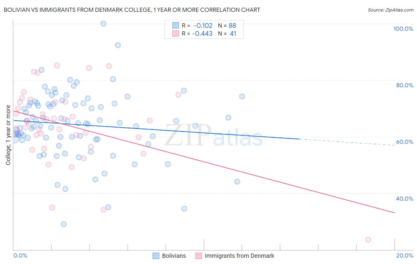 Bolivian vs Immigrants from Denmark College, 1 year or more Correlation Chart