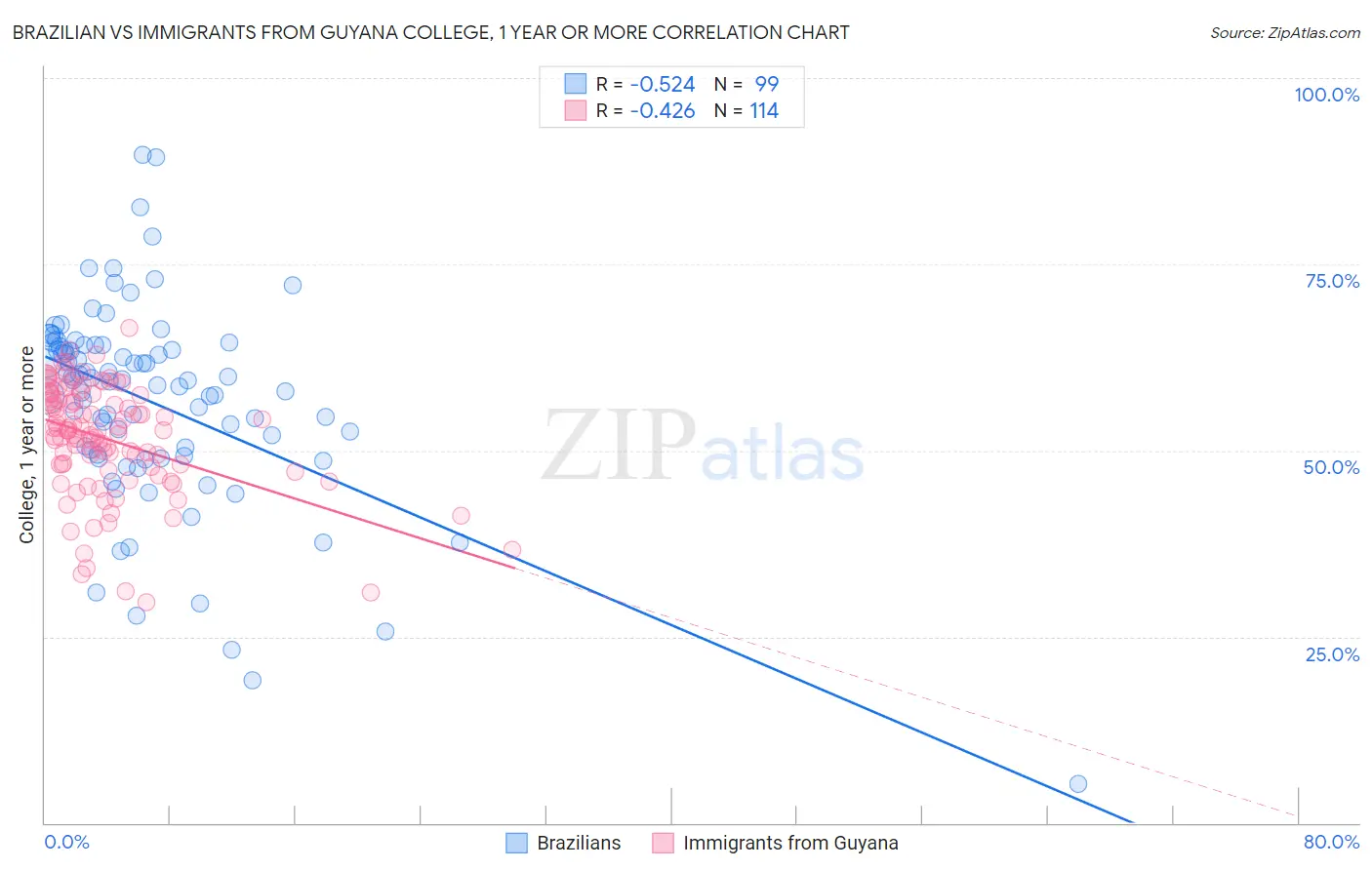 Brazilian vs Immigrants from Guyana College, 1 year or more Correlation Chart