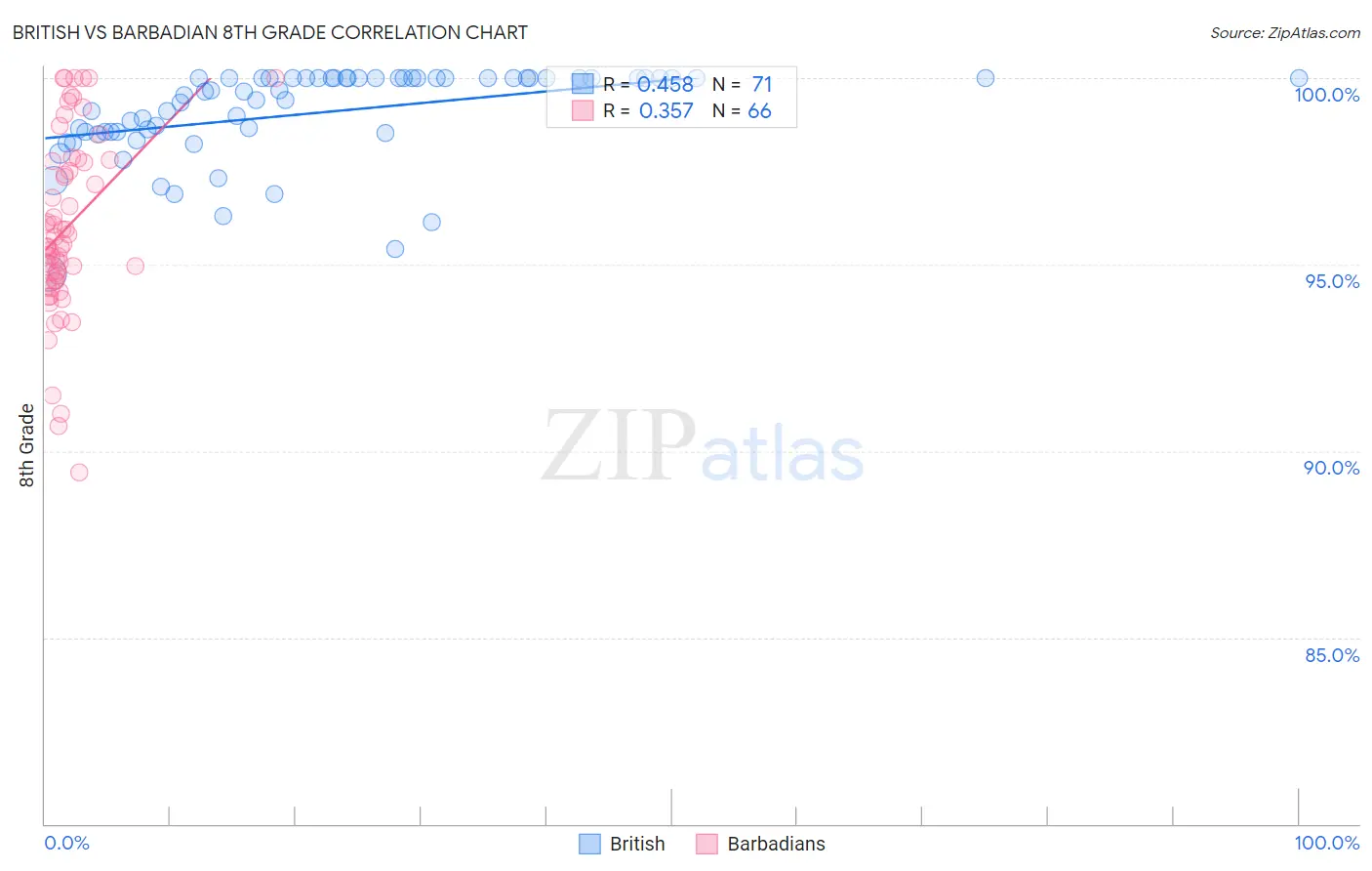 The statistical analysis conducted on geographies consisting of 531,463,582 people shows a moderate positive correlation between the proportion of British and percentage of population with at least 8th grade education in the United States with a correlation coefficient (R) of 0.458 and weighted average of 97.0%. Similarly, the statistical analysis conducted on geographies consisting of 141,299,217 people shows a mild positive correlation between the proportion of Barbadians and percentage of population with at least 8th grade education in the United States with a correlation coefficient (R) of 0.357 and weighted average of 94.6%, a difference of 2.5%.