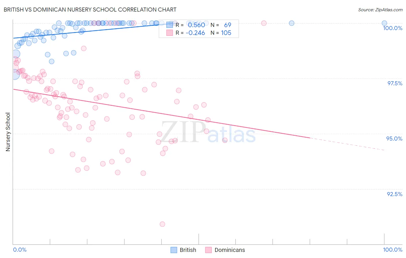 The statistical analysis conducted on geographies consisting of 531,462,526 people shows a substantial positive correlation between the proportion of British and percentage of population with at least nursery school education in the United States with a correlation coefficient (R) of 0.560 and weighted average of 98.5%. Similarly, the statistical analysis conducted on geographies consisting of 355,142,603 people shows a weak negative correlation between the proportion of Dominicans and percentage of population with at least nursery school education in the United States with a correlation coefficient (R) of -0.246 and weighted average of 96.8%, a difference of 1.8%.