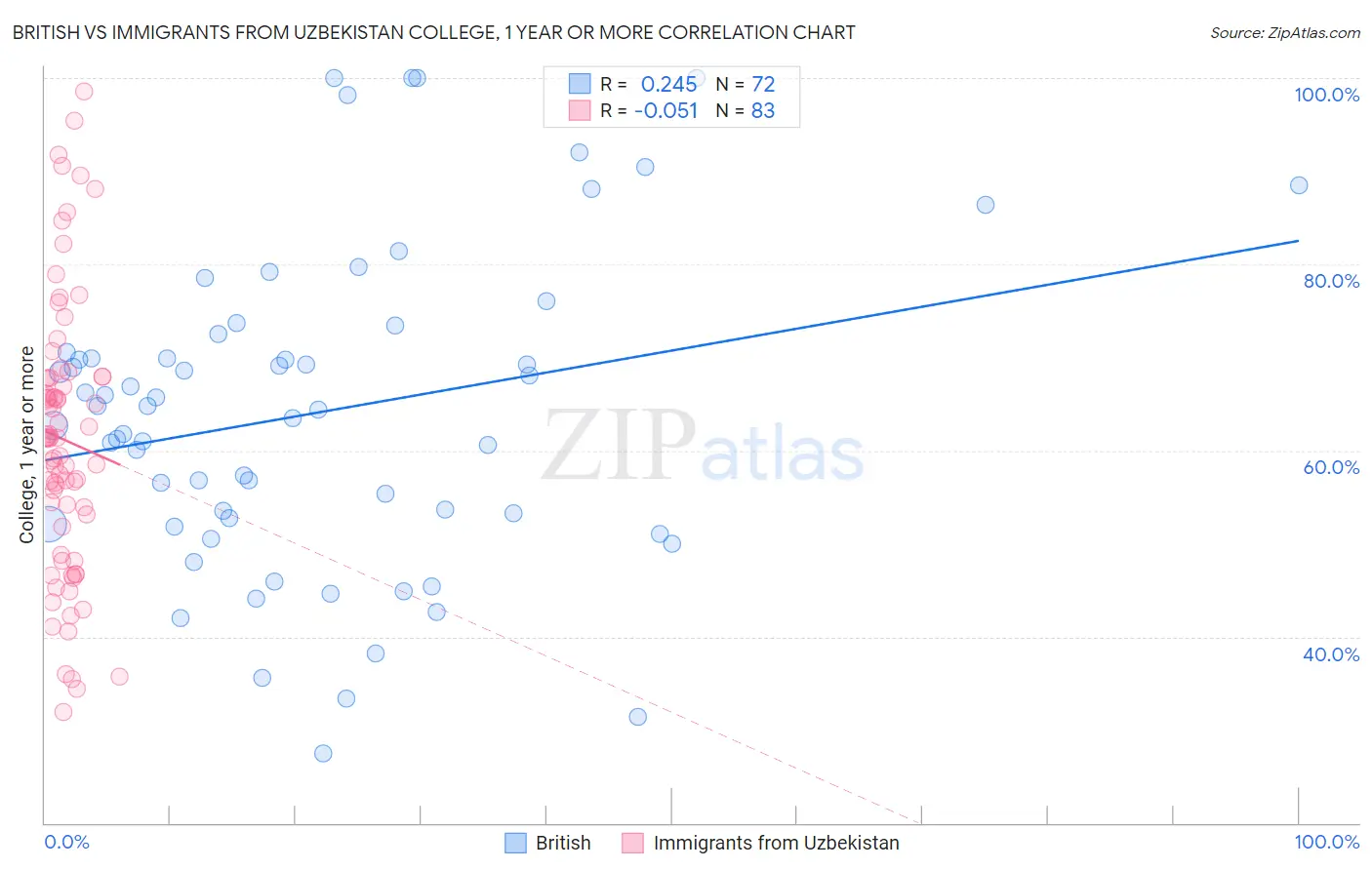 British vs Immigrants from Uzbekistan College, 1 year or more Correlation Chart
