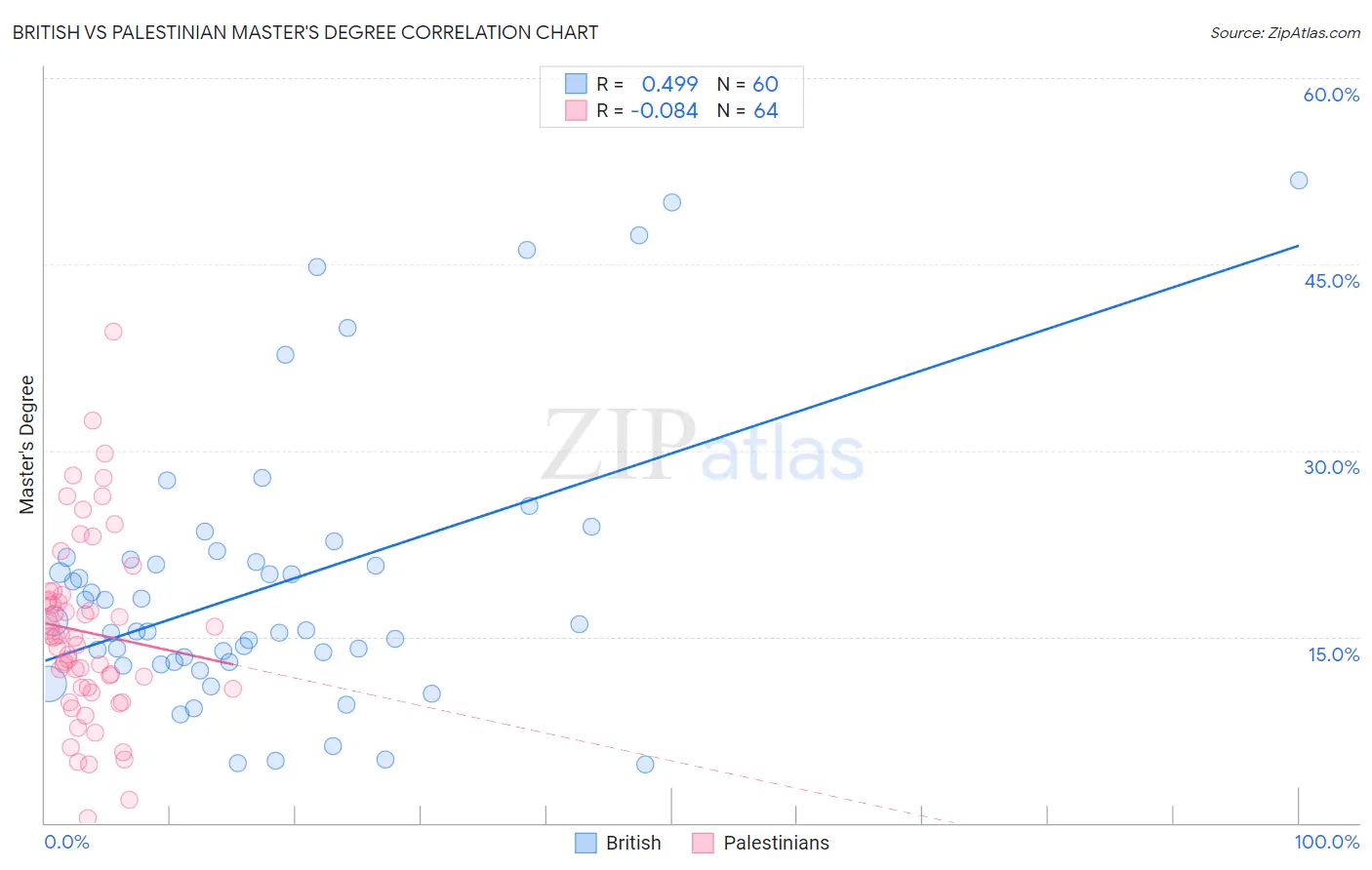 In terms of master's degree, the demographic groups most similar to British are Croatian (16.4%, a difference of 0.010%), Immigrants from Eritrea (16.4%, a difference of 0.080%), Italian (16.4%, a difference of 0.16%), Immigrants from Eastern Africa (16.3%, a difference of 0.27%), and Afghan (16.5%, a difference of 0.43%). Similarly, the demographic groups most similar to Palestinians are Immigrants from Sierra Leone (16.3%, a difference of 0.050%), Immigrants from Eastern Africa (16.3%, a difference of 0.26%), Italian (16.4%, a difference of 0.37%), Immigrants from Eritrea (16.4%, a difference of 0.45%), and Croatian (16.4%, a difference of 0.52%).