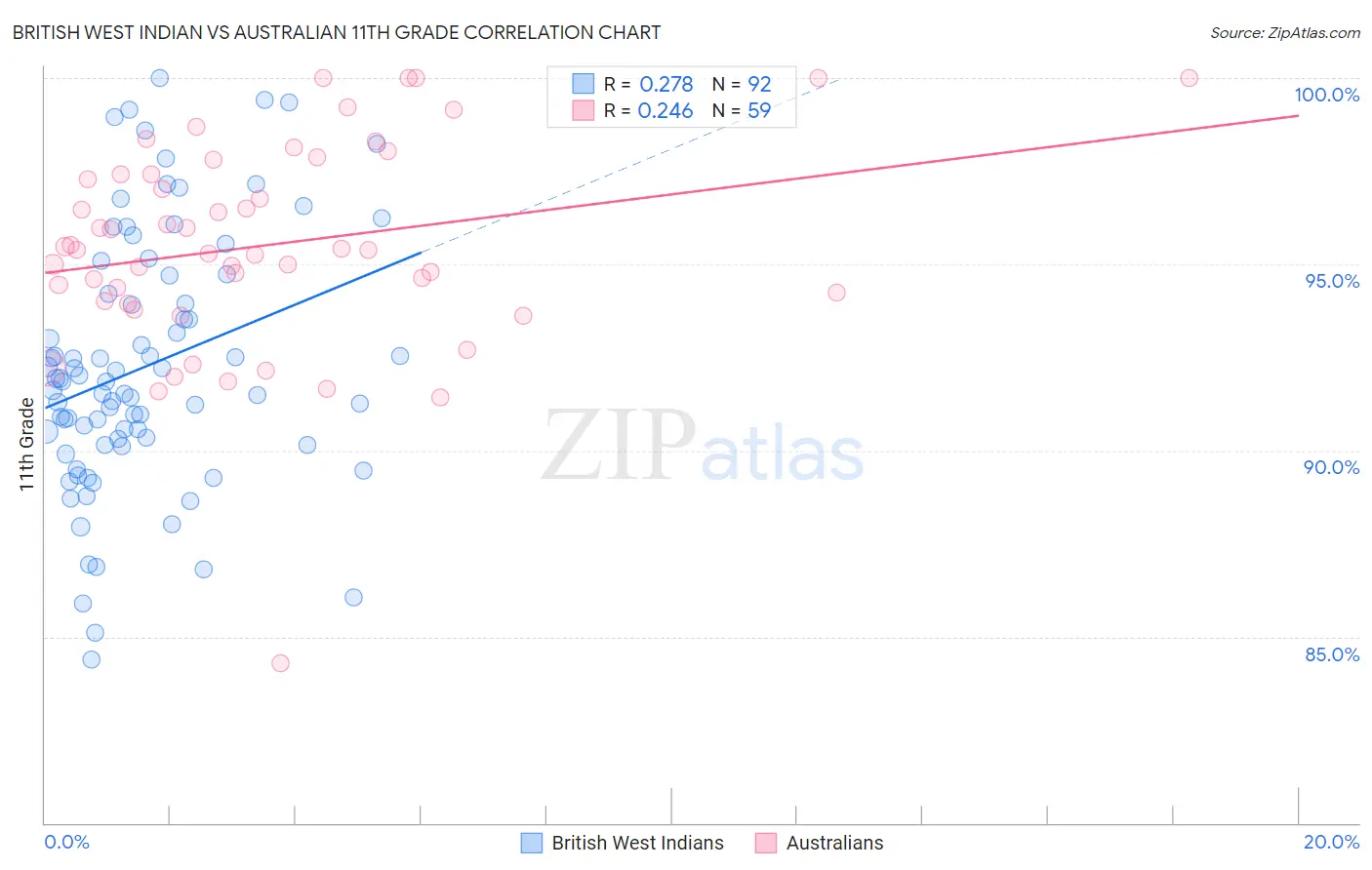 The statistical analysis conducted on geographies consisting of 152,691,173 people shows a weak positive correlation between the proportion of British West Indians and percentage of population with at least 11th grade education in the United States with a correlation coefficient (R) of 0.278 and weighted average of 90.3%. Similarly, the statistical analysis conducted on geographies consisting of 224,153,693 people shows a weak positive correlation between the proportion of Australians and percentage of population with at least 11th grade education in the United States with a correlation coefficient (R) of 0.246 and weighted average of 94.1%, a difference of 4.2%.