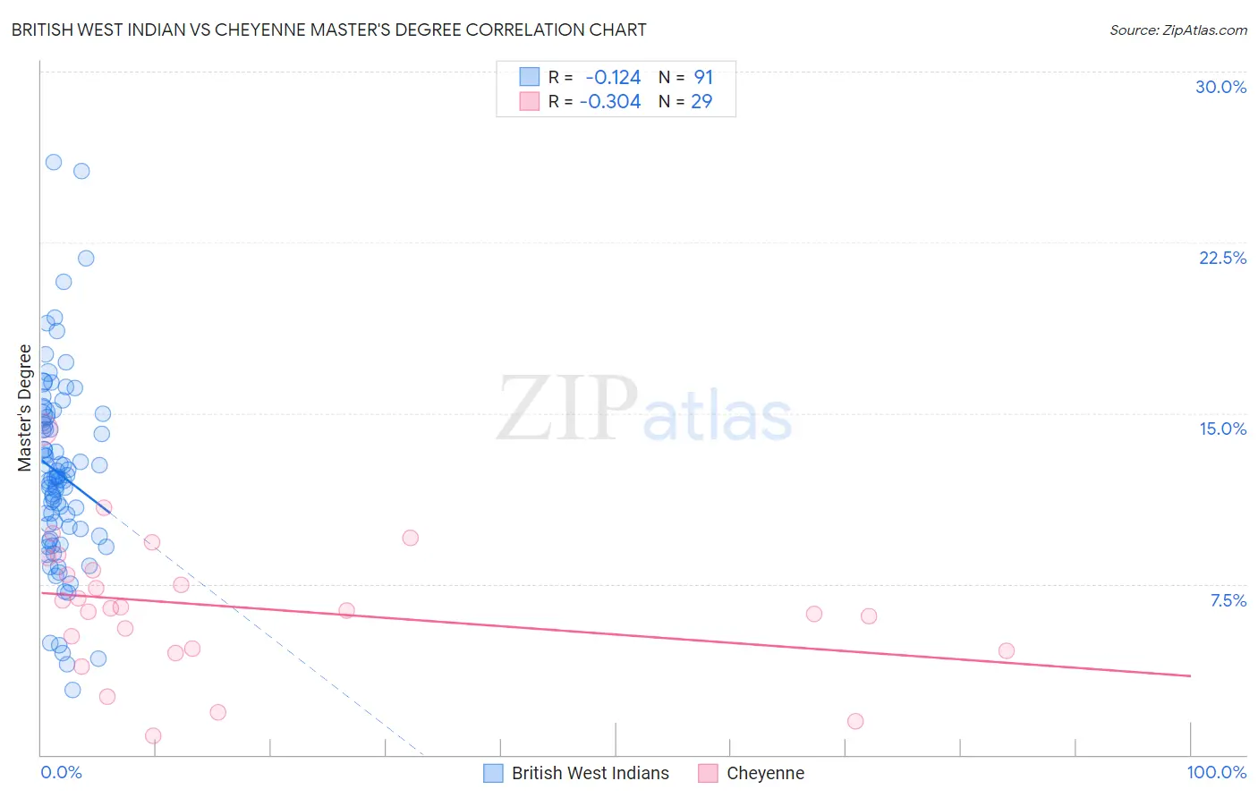 The statistical analysis conducted on geographies consisting of 152,656,458 people shows a poor negative correlation between the proportion of British West Indians and percentage of population with at least master's degree education in the United States with a correlation coefficient (R) of -0.124 and weighted average of 13.8%. Similarly, the statistical analysis conducted on geographies consisting of 80,705,312 people shows a mild negative correlation between the proportion of Cheyenne and percentage of population with at least master's degree education in the United States with a correlation coefficient (R) of -0.304 and weighted average of 11.2%, a difference of 22.9%.