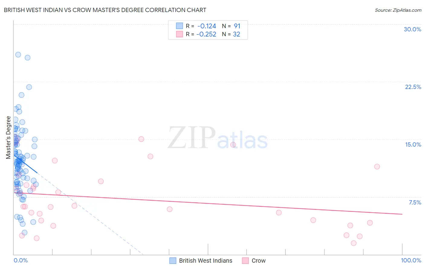 The statistical analysis conducted on geographies consisting of 152,656,458 people shows a poor negative correlation between the proportion of British West Indians and percentage of population with at least master's degree education in the United States with a correlation coefficient (R) of -0.124 and weighted average of 13.8%. Similarly, the statistical analysis conducted on geographies consisting of 59,200,277 people shows a weak negative correlation between the proportion of Crow and percentage of population with at least master's degree education in the United States with a correlation coefficient (R) of -0.252 and weighted average of 10.6%, a difference of 29.8%.